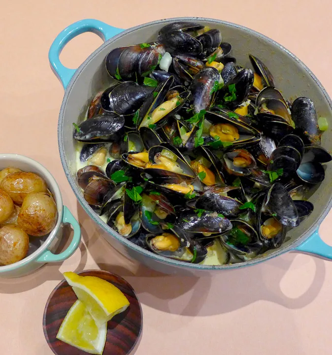Og det er akkurat en slik rett jeg har laget her. Blåskjell i kremet karrisaus med perfekte poteter til. Blåskjellene er så fine nå. Små, men smaksrike. De er billige og det er rene luksusmaten. Et nett med blåskjell passer perfekt til to personer. Dette er skikkelig fastfood. Det tar kort tid å lage, så ha alle elementer klare til retten før du begynner å koke..