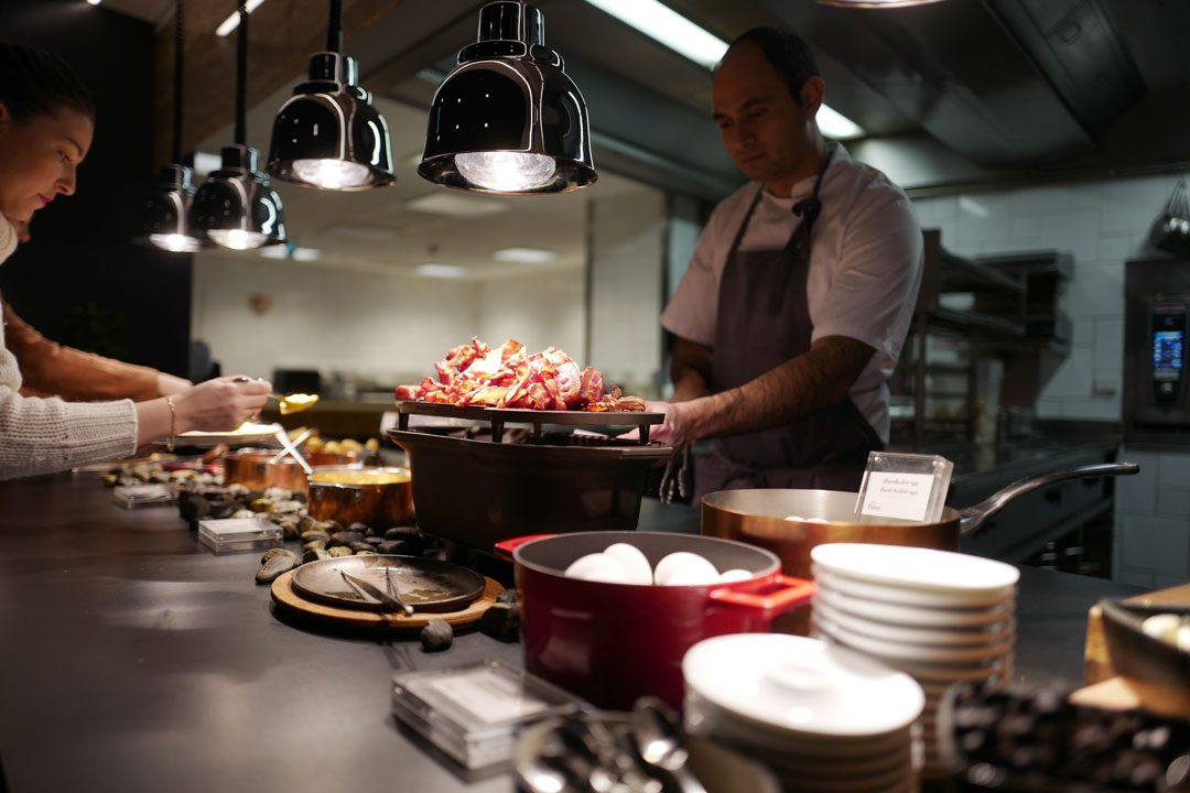 Bocuse d’Or-vinner, Ørjan Johannessen er tilstede og forteller ivrig om både den krevende kokkekonkuransen og Thon Hotel sin frokostbuffet. Her får man hjemmelagde syltetøy, honning fra hele Oslo, bacon fra A.Idsøe som ligger over glødenede kull (og får dermed en fantastisk aroma), kremete eggerøre, stekte egg, lammepølser, kjøttboller, reinskav, rosenkål og andre erkenorske produkter som vafler, fenalår, klippfisk og røkelaks. De har juicer fra Egge gård og hjemmelagde smoothies. De er for gjort å ryke på en tre-retters frokost her.
