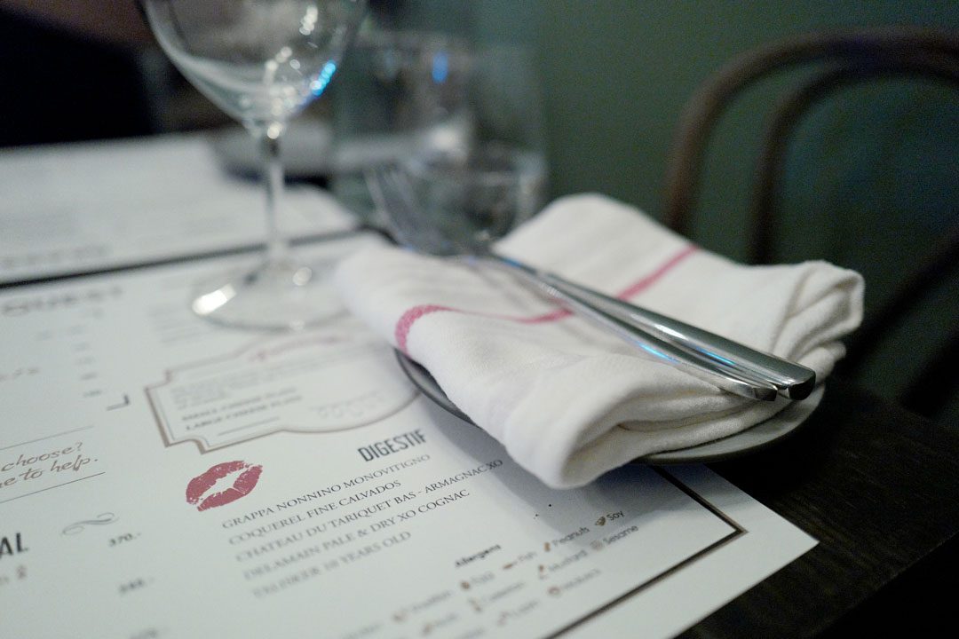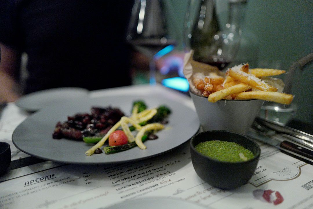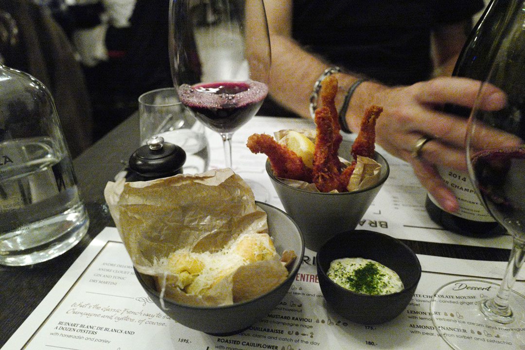 Menyen på Brasserie Ouest er spennende og det er supervanskelig å bestemme seg. Vi går for flere småretter/forretter og deler en hovedrett og dessert.
