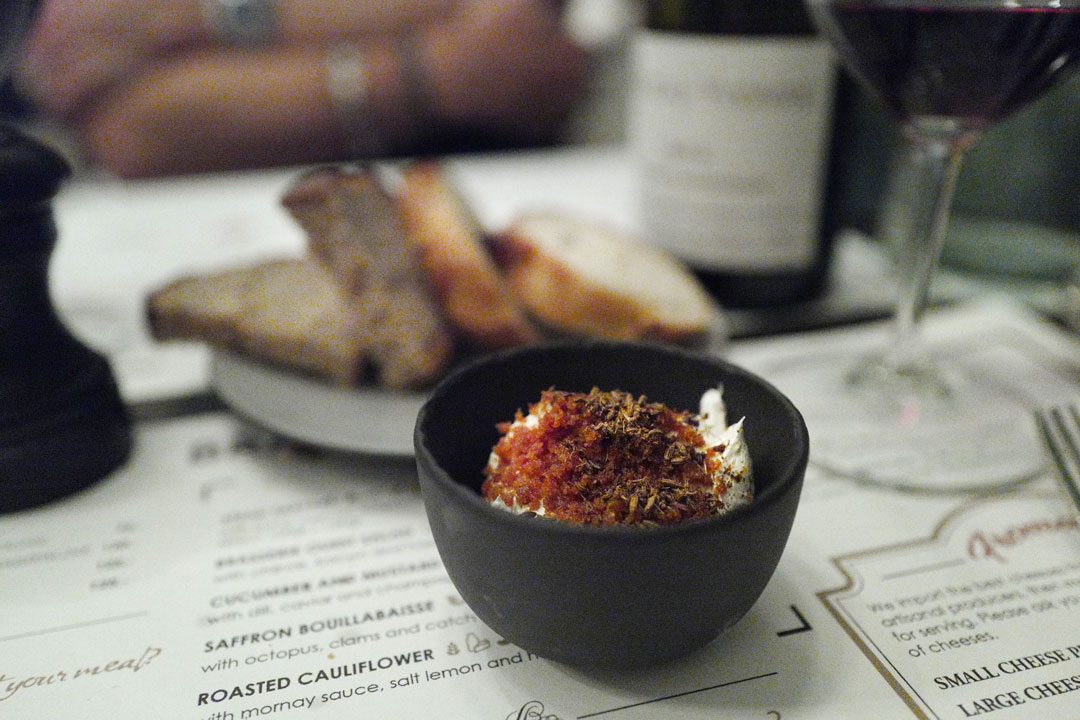 Vi får brød på bordet. Det serveres med pisket smør med karve og ristet gjær. Skummelt godt og en deilig hvilerett før hovedretten kommer inn.