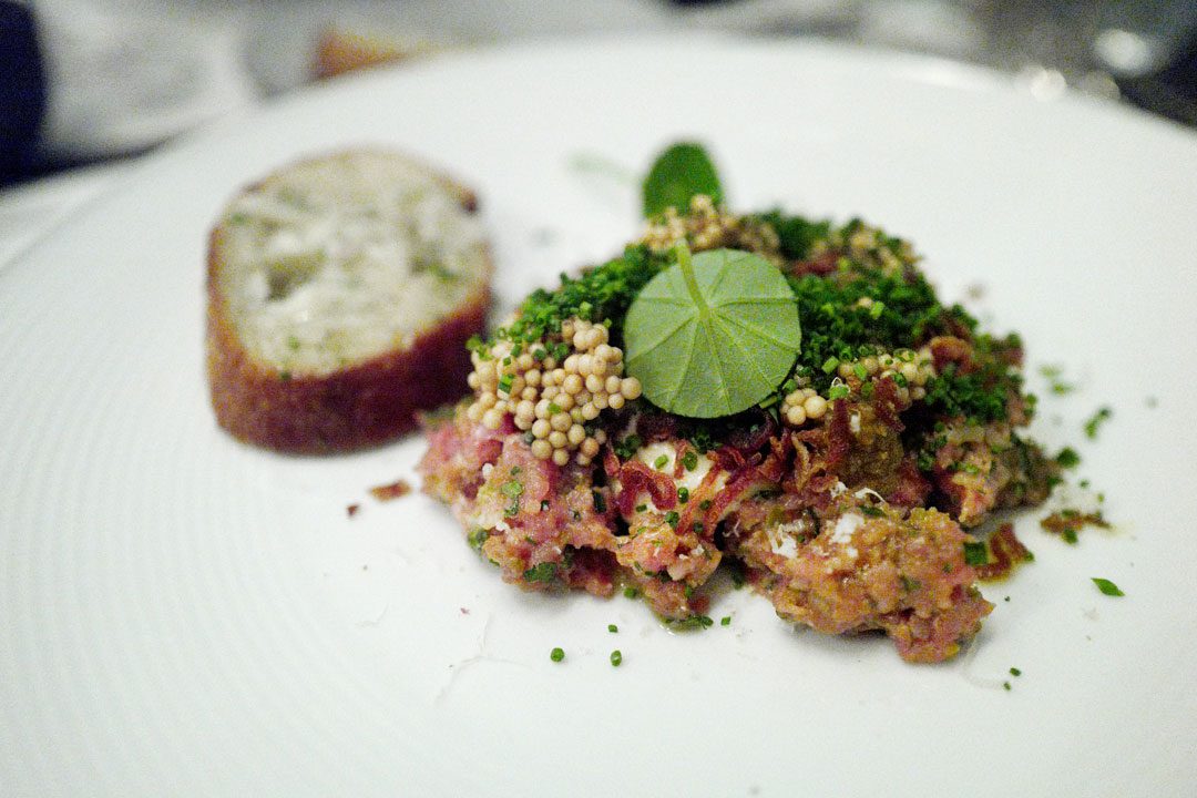 Forrett nummer to er en helt vidunderlig tartar med sennepsfrø, løk og toast med smeltet beinmarg og persille. Denne retten kan bestilles i to størrelser på 100 eller 150 gram. Som hovedrett vil 150 g være rikelig.