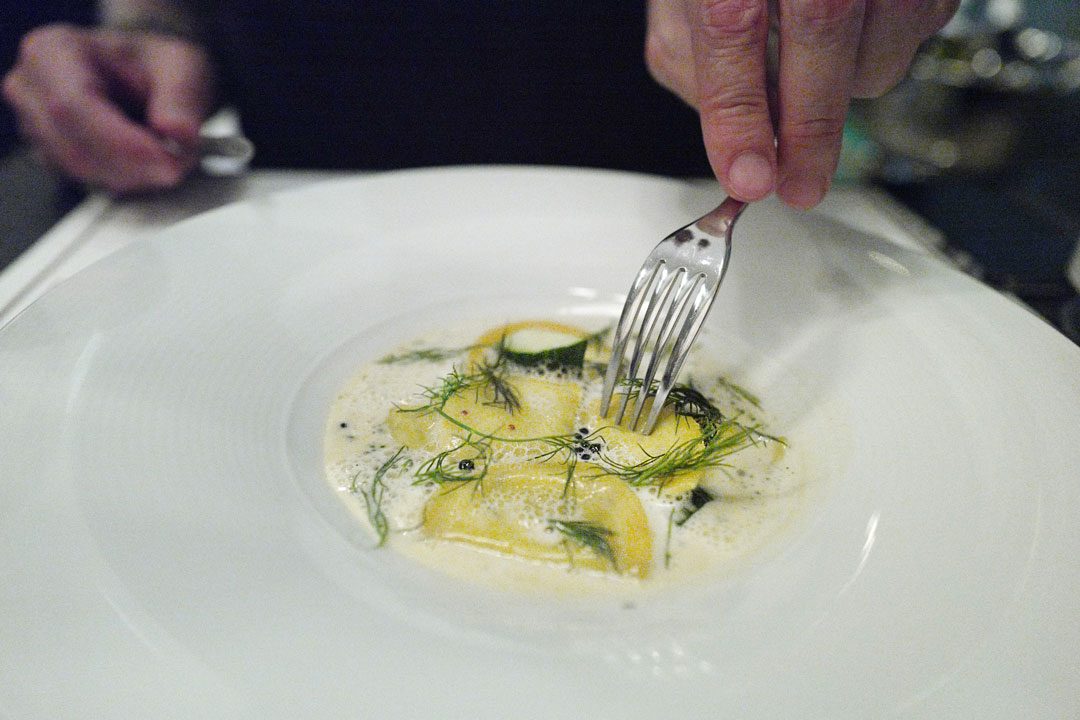 Vi deler to forretter og først ut er en utsøkt agurk- og sennepsravioli med dill, kaviar og champagne nage. Veldig synd vi ikke får en skje til å scoope opp den deilige, smaksrike sausen med. Vi går derfor også glipp av mye av kaviaren som svømmer rundt. Å prøve å fange kaviarkuler med gaffel er et like håpløst prosjekt som å stable erter med boksehansker.