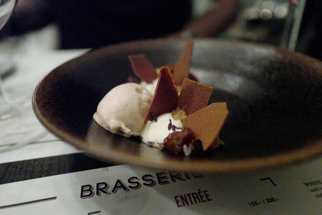 Erik vil ha dessert og klarer ikke å motstå hvit sjokolademousse med lavendel, kandisert ingefær and ferskensorbet. Jeg er litt uheldig her og får en skje med halve lavendelåkeren i. Sett bort i fra denne tabben fra min side (må skylde på dunkel belysning) kan det bekreftes fra bordkavaleren min at desserten var utsøkt.