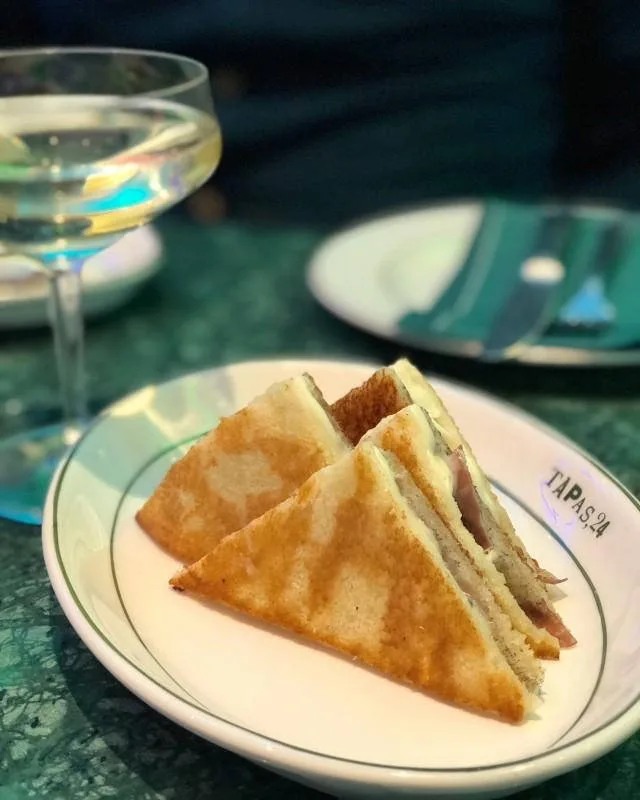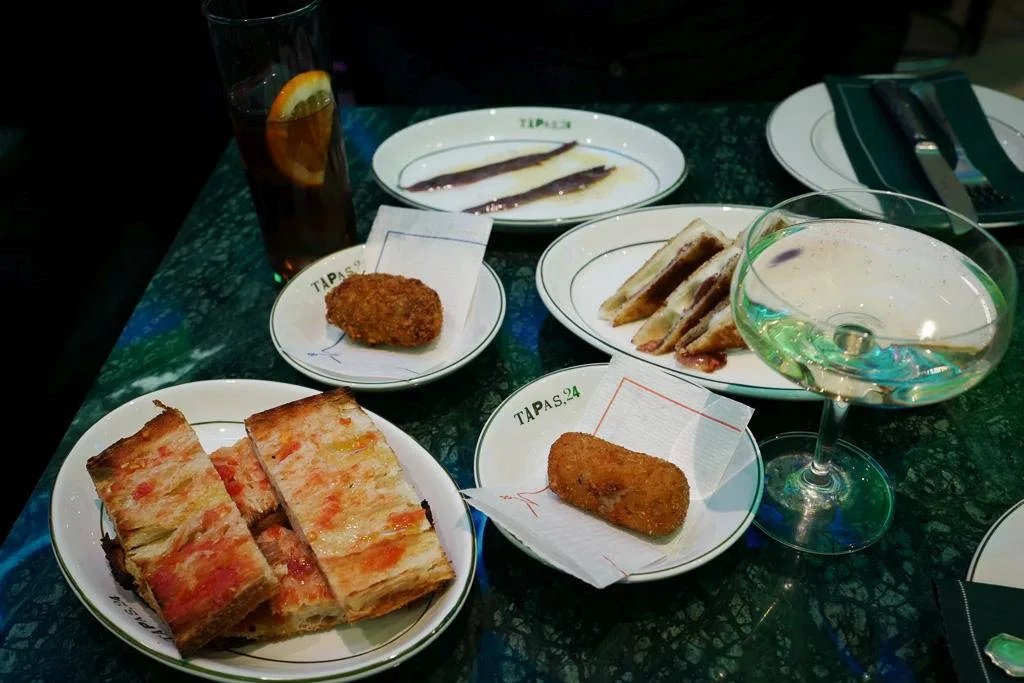 En av mine favorittretter på Tapas 24 og som jeg har spist på Tapas 24 lenger ned i byen tidligere, er smørstekt bikini (spansk navn på ostesmørbrød) med ibericoskinke og trøffel. Det er bare en drøm av et ostesmørbrød. Ellers gikk vi for ansjoser, pan con tomate, kroketter laget av ibericoskinke og noen aldeles nydelige kyllingkroketter.
