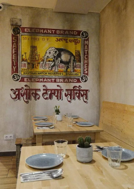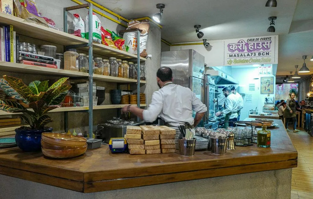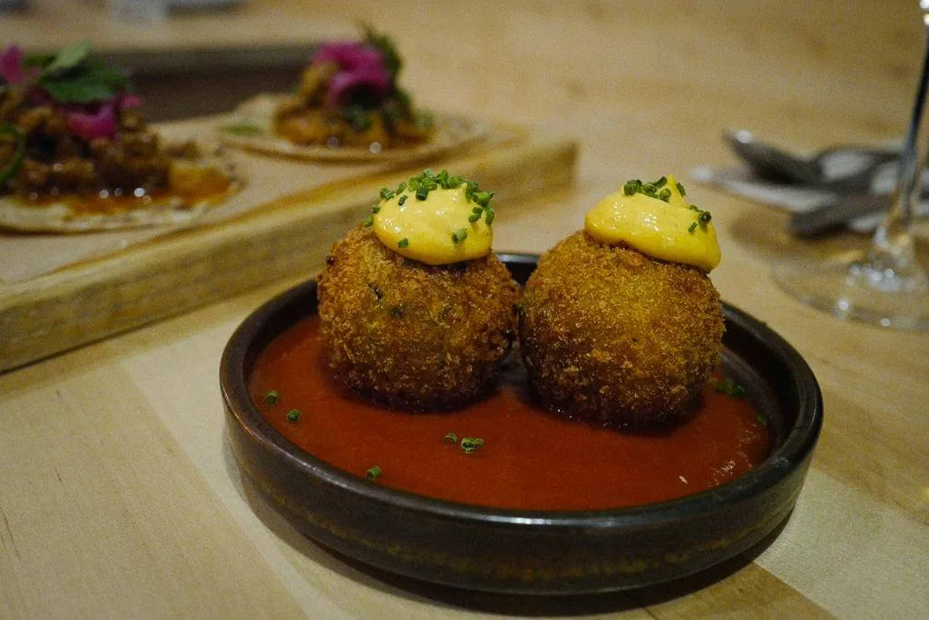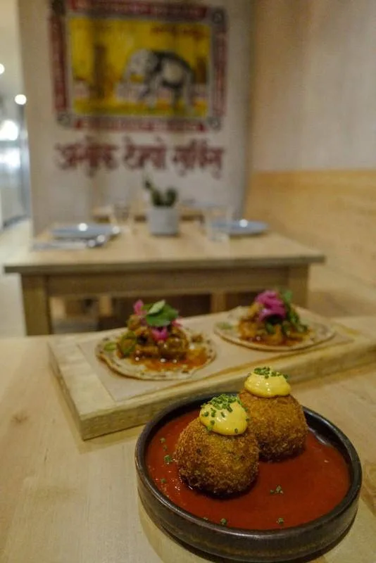Bomba Mumbai spiller på katalanske bombas – Frityrstekte boller med potet- og kjøttfyll. Disse er laget med kikerter, poteter, erter, salsa brava (typisk sterk tomatsaus fra Katalonia) og karrimajones. En fantastisk kombinasjon av indisk og katalansk tradisjonsretter.