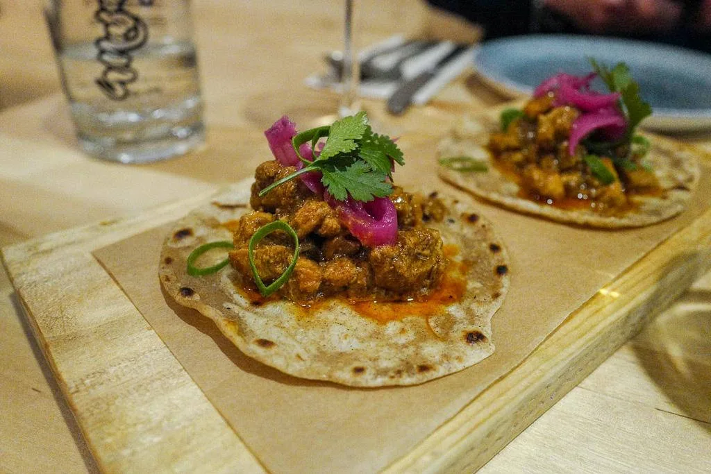 Vi bestiller taco vindaloo laget av ibericosvin servert med syltet løk og koriander. Lefsene som brukes er klassiske indiske chapati. Vi kunne ha bestilt tre porsjoner til. Så gode!