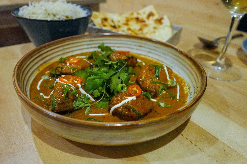 Vi spiser nydelig kylling curri med kokosmelk, fluffy basmatiris og nybakt nanbrød. En perfekt rett å dele akkurat som de andre rettene på menyen.
