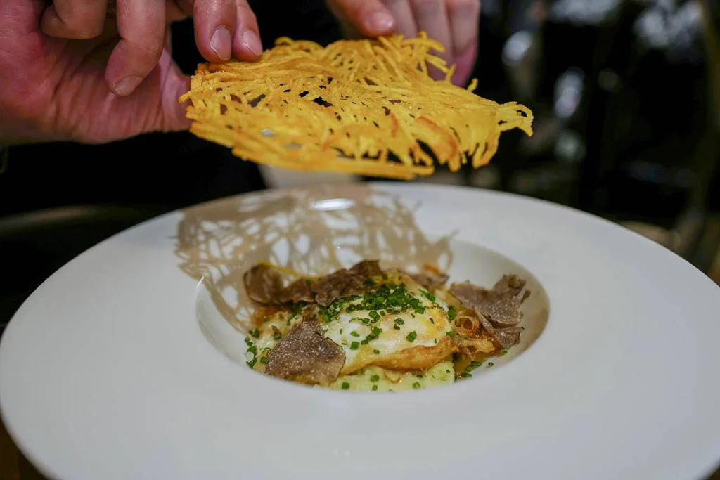 Så over til trøffelavdelingen. Vi går for en rett med potet, egg og trøffel. Retten ligger under et lag av fritert potetsticks. Poteten er brukt i en florlett puré. Egget er rennende i midten og trøffel er høvlet over. Hvor perfekt er ikke det? Når du skjærer igjennom egget blandes plommen med kremet potet og mild og deilig trøffel. Jeg er i himmelen.