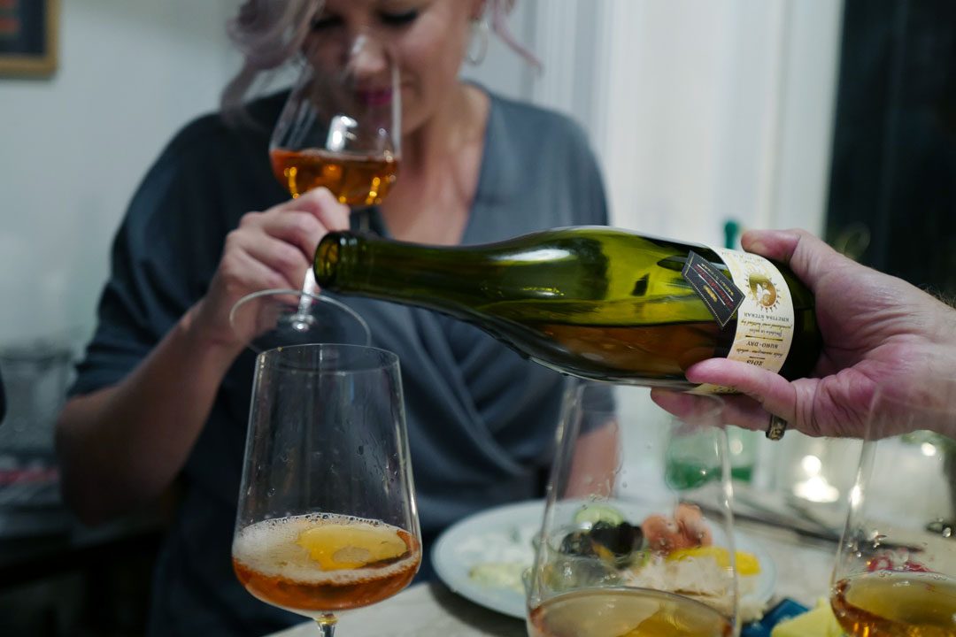 Da setter vi i gang. Vinene kommer her i tilfeldig rekkefølge. Dog begynner vi med litt bobler som vi også tester opp mot skalldyrene.