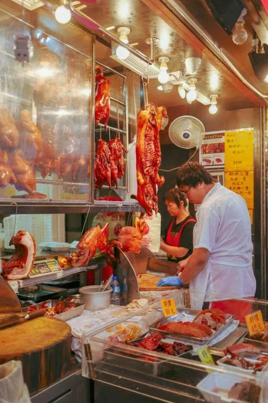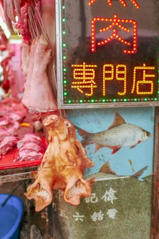 Her må du rett og slett bare gå på kryss og tvers og se glinsende ender og sprø ribbesider hengende på kroker. Kyllingføtter ligger i bokser. De er attraktiv mat pga av det høye innholdet av kollagen. Fisk svømmer i kar og blir slaktet når kunden bestemmer hvilken fisk som skal med hjem i posen.
