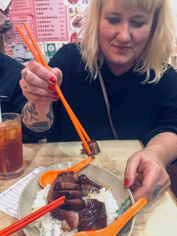 Erik og jeg deler en porsjon med gås og ris og drikker hver vår deilige Hong Kong Lemon Iced Tea til og vi regningen kommer på 100 HK$ (som er ca 100 norske kroner). Ja, dyrt er det ikke!