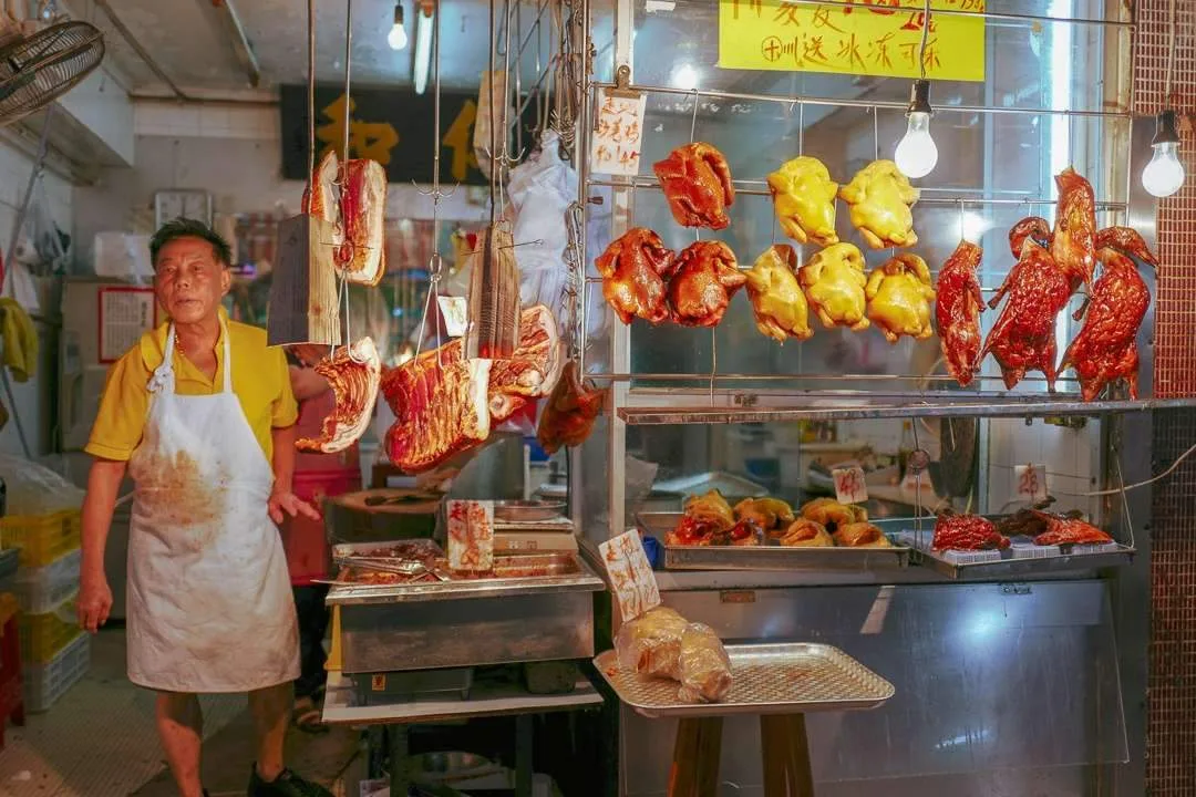 Her må du rett og slett bare gå på kryss og tvers og se glinsende ender og sprø ribbesider hengende på kroker. Kyllingføtter ligger i bokser. De er attraktiv mat pga av det høye innholdet av kollagen. Fisk svømmer i kar og blir slaktet når kunden bestemmer hvilken fisk som skal med hjem i posen.