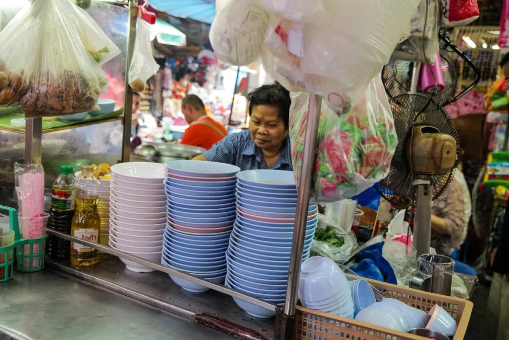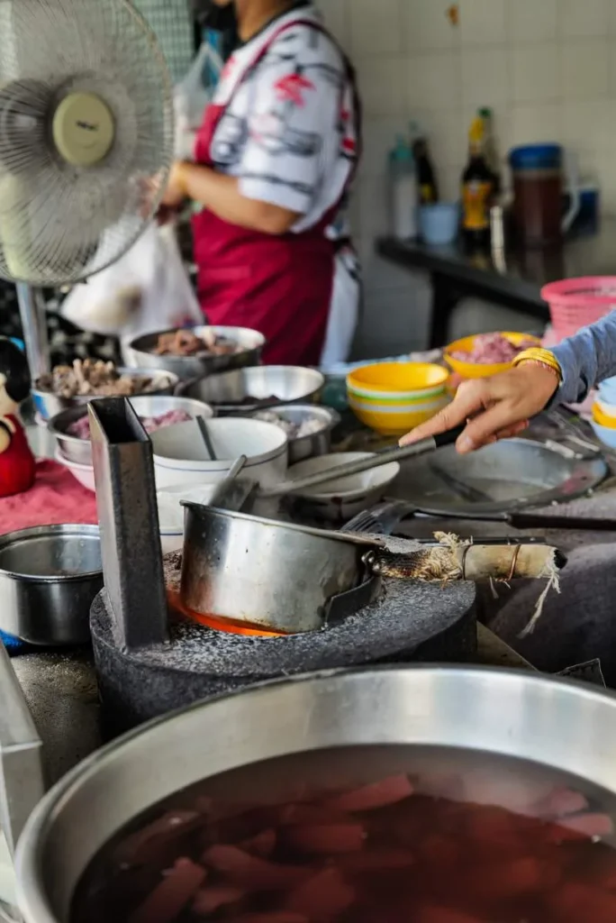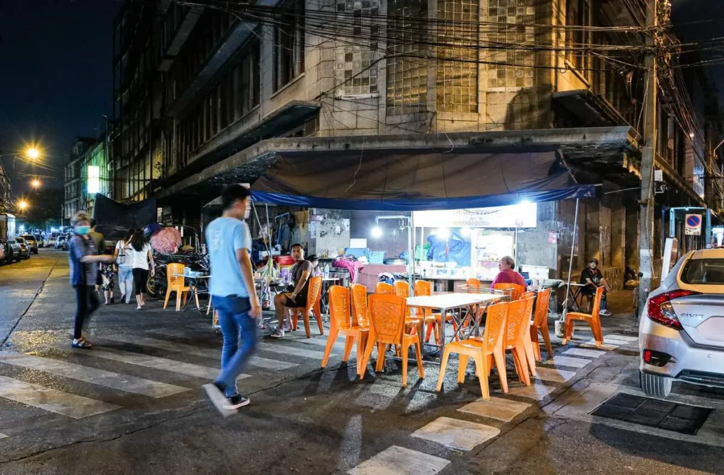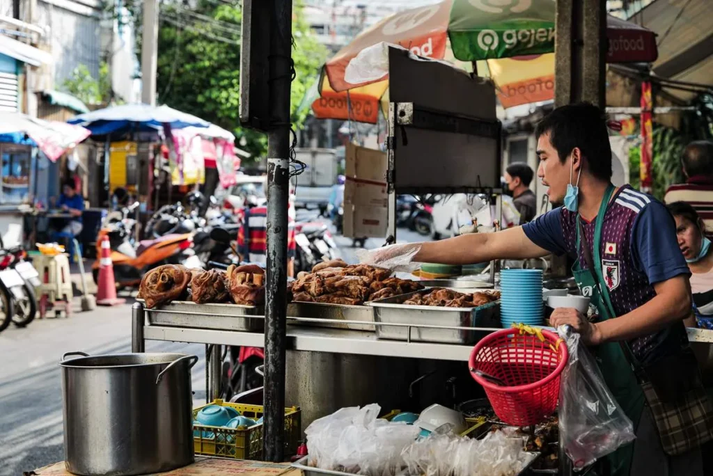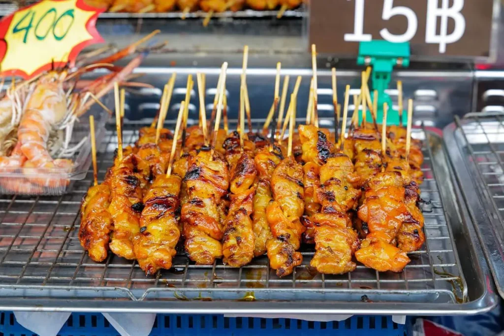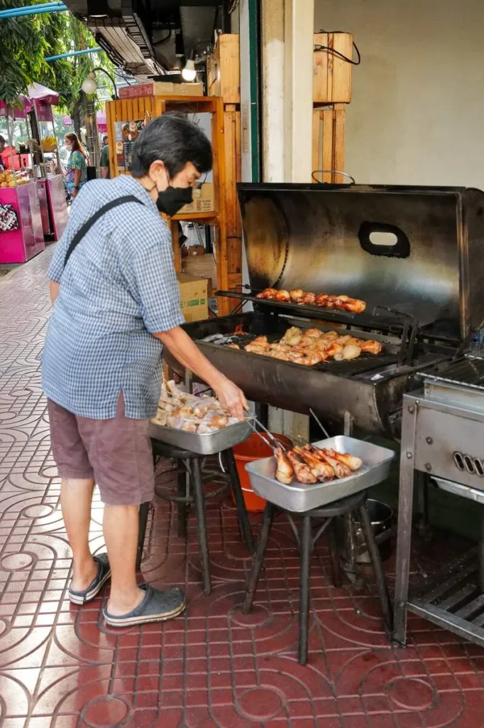 Kylling grilles over glør (Gai Yang). De kjente grillspydene (Moo Ping) glinser i solen. Oppkuttet, moden frukt selges med tamarind- og chilisalt. Suppe helles i plastposer og selges til folk som skal videre på jobb. Det er et paradis for alle som er interesserte i god mat. Det er billig, variert og næringsrikt. Det er farger, sterke smaker og fristelser i hver rett. Hadde jeg ikke nettopp spist ribbe til frokost skulle jeg ha spist meg oppover hele gata. Det er Charoen Krung Rd jeg snakker om i dette tilfelle.