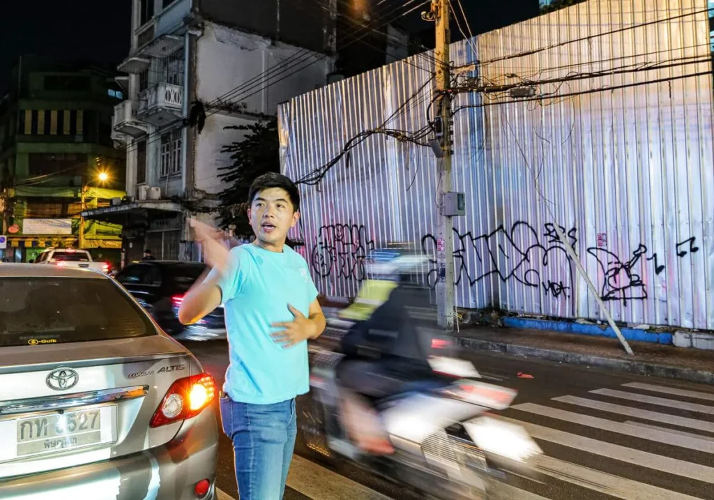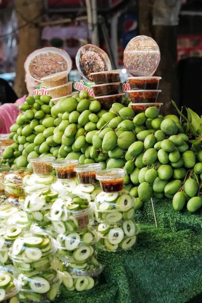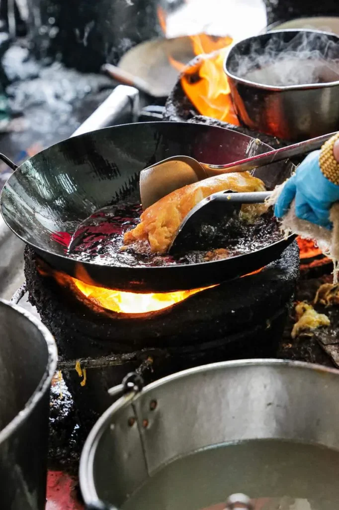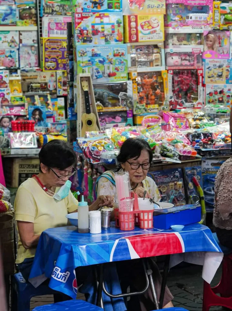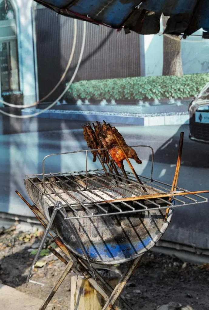 Kylling grilles over glør (Gai Yang). De kjente grillspydene (Moo Ping) glinser i solen. Oppkuttet, moden frukt selges med tamarind- og chilisalt. Suppe helles i plastposer og selges til folk som skal videre på jobb. Det er et paradis for alle som er interesserte i god mat. Det er billig, variert og næringsrikt. Det er farger, sterke smaker og fristelser i hver rett. Hadde jeg ikke nettopp spist ribbe til frokost skulle jeg ha spist meg oppover hele gata. Det er Charoen Krung Rd jeg snakker om i dette tilfelle.