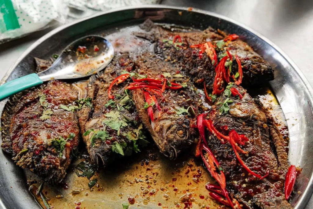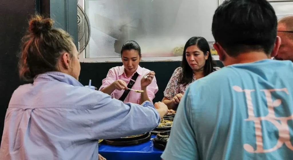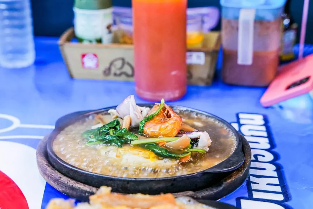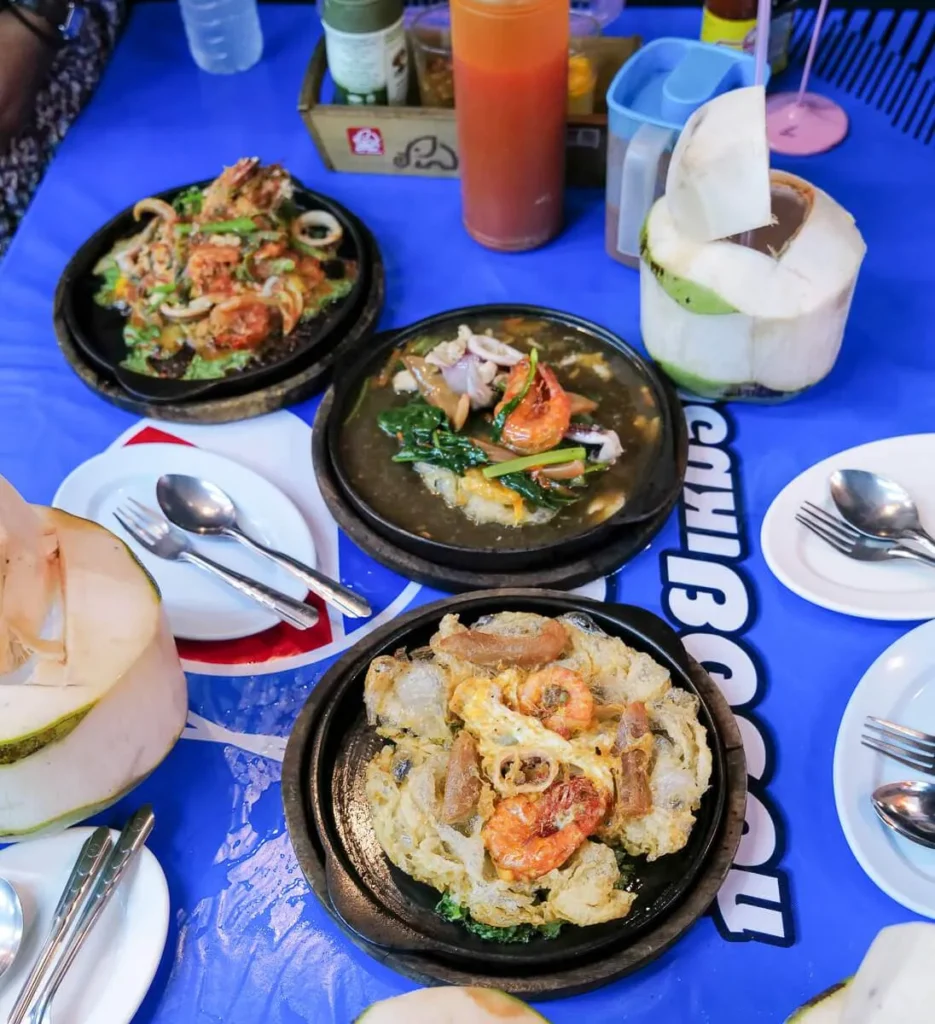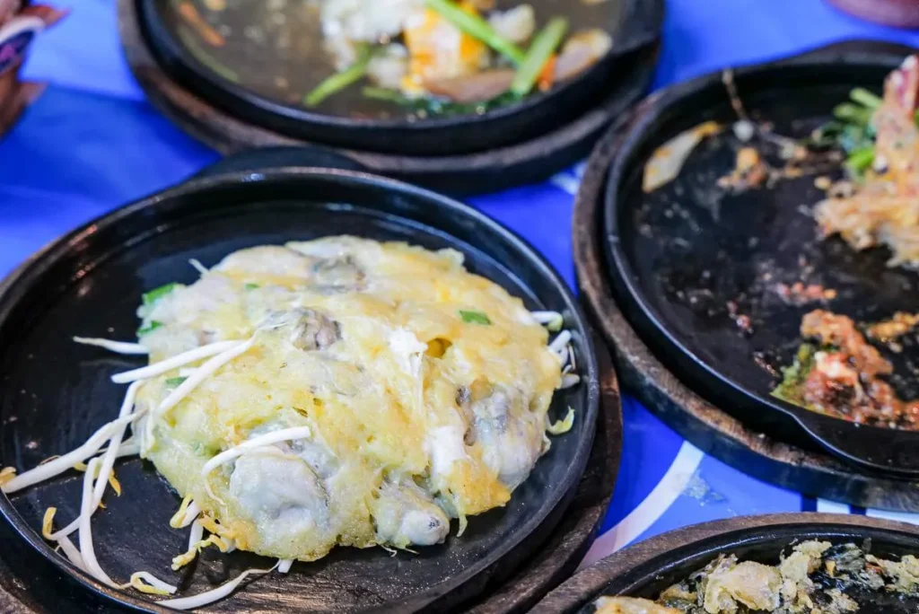 Dette stedet er berømt for sine friterte østersomeletter og en brennhet rett med «lava-saus». Sausen helles over retten ved bordet og når den treffer det varme støpejernsfatet bobler sausen. Bra show og god rett. Østersomeletten er helt nydelig. Den kommer i en halvstekt variant der østersene er mer rå og en som er mer stekt. Begge var aldeles nydelige.