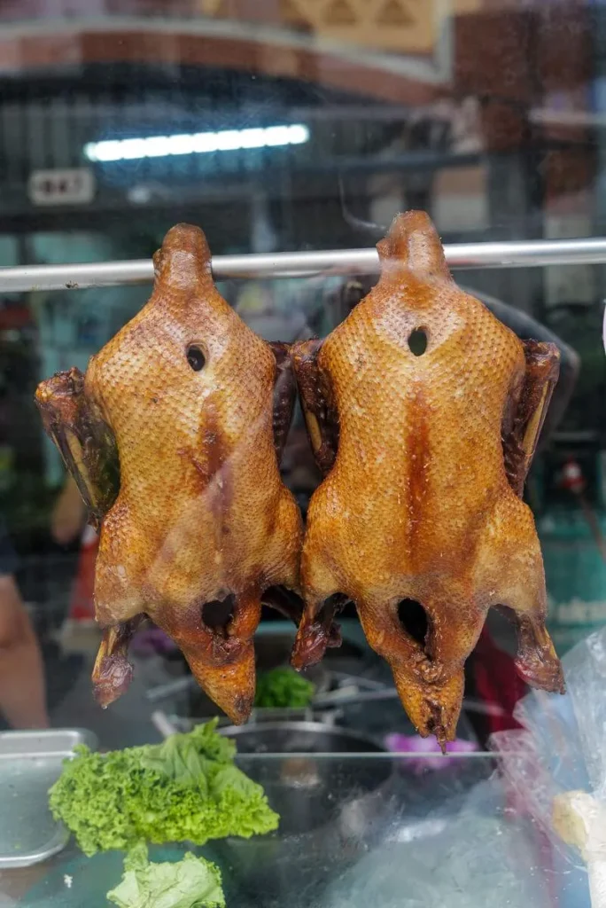 Duck Noodle House (เป็ดตุ๋น เจ้าท่า) (Adresse: 945 Soi Wanit 2, Talat Noi, Samphanthawong, Bangkok 10100) er verdt å stoppe opp ved. Utenfor henger nystekte ender og gjess. Dette er et sted som spesialiserer seg på retter laget av de herlige råvarene. Innenfor døren sitter bestemor Noi og tar seg av betalingen og ikke minst å sørge for å skrike høyest mulig til alle i lokalet. Hun er bare blid altså og hun kommuniserer på denne måten som mange andre thaier. Det er mye liv i Bangkok og folk snakker høyt fra en del av et lokale til det andre. Helt vanlig, åpenbart. Jeg spiser andesuppe med valgfrie nudler, sprøstekt hvitløk, spirer og gressløk. Jeg elsker disse suppene. Så næringsrike og proppfulle av smak.
