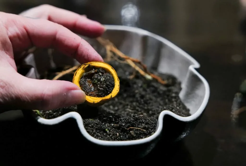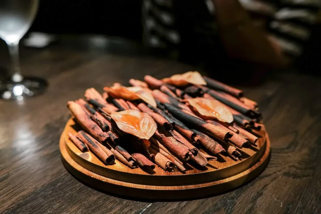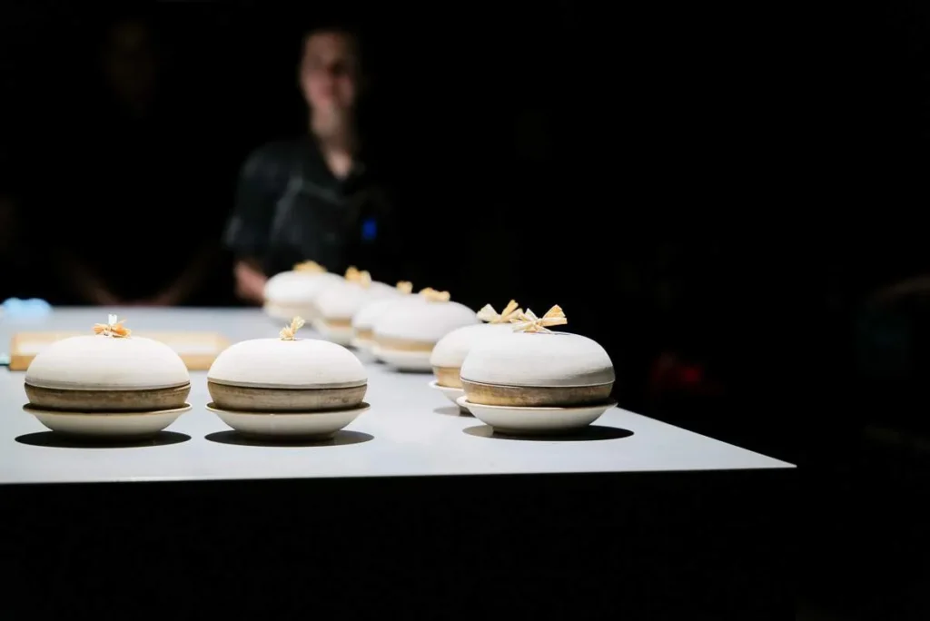 Første rett servers under et sølvfarget appelsintre. Under treet siver røyk ut og små kanelfargede blader popper frem.