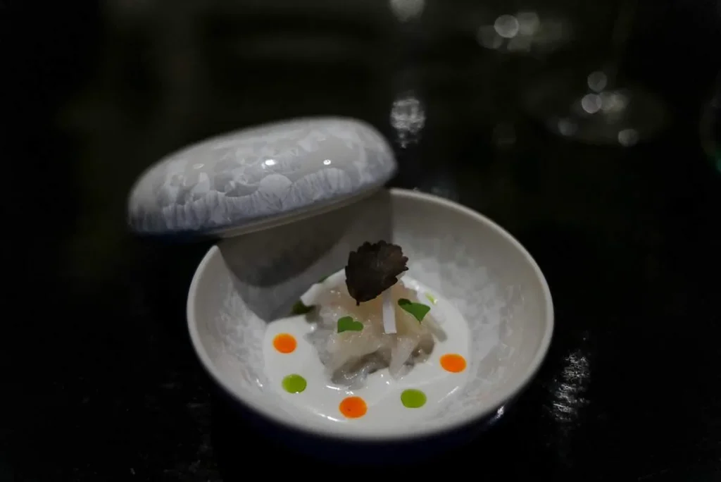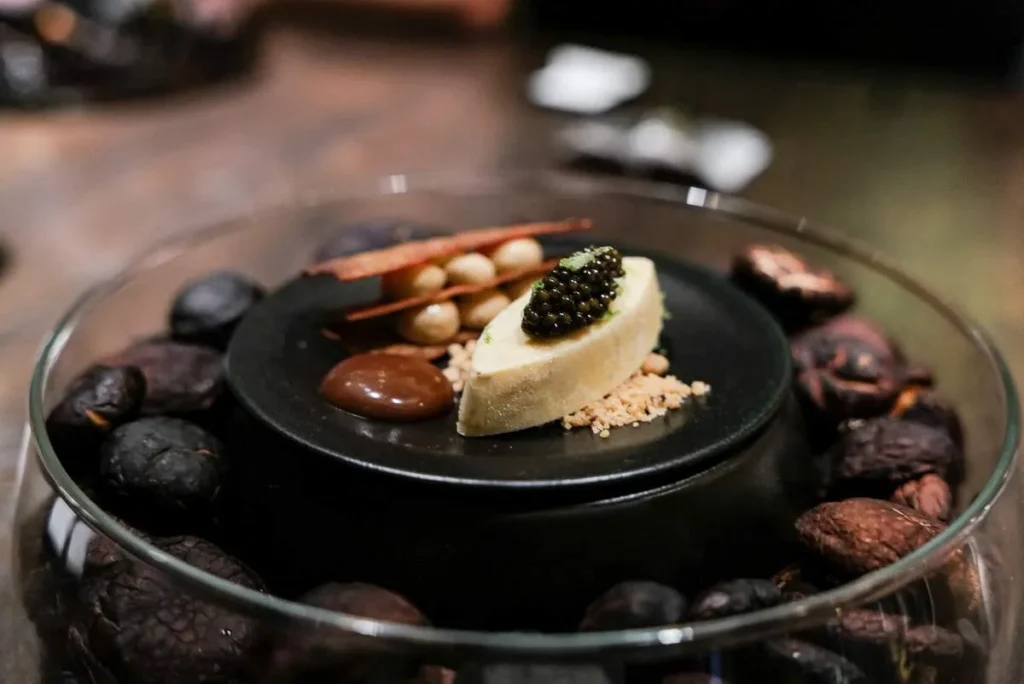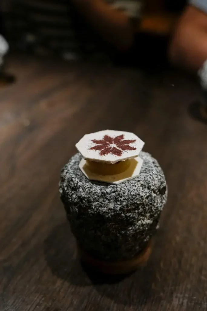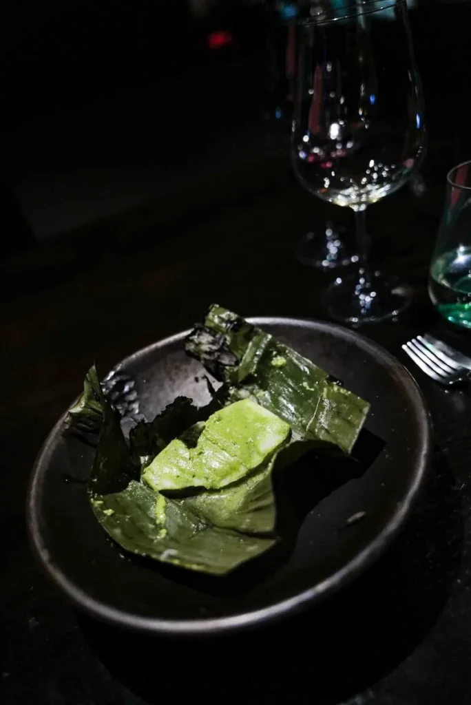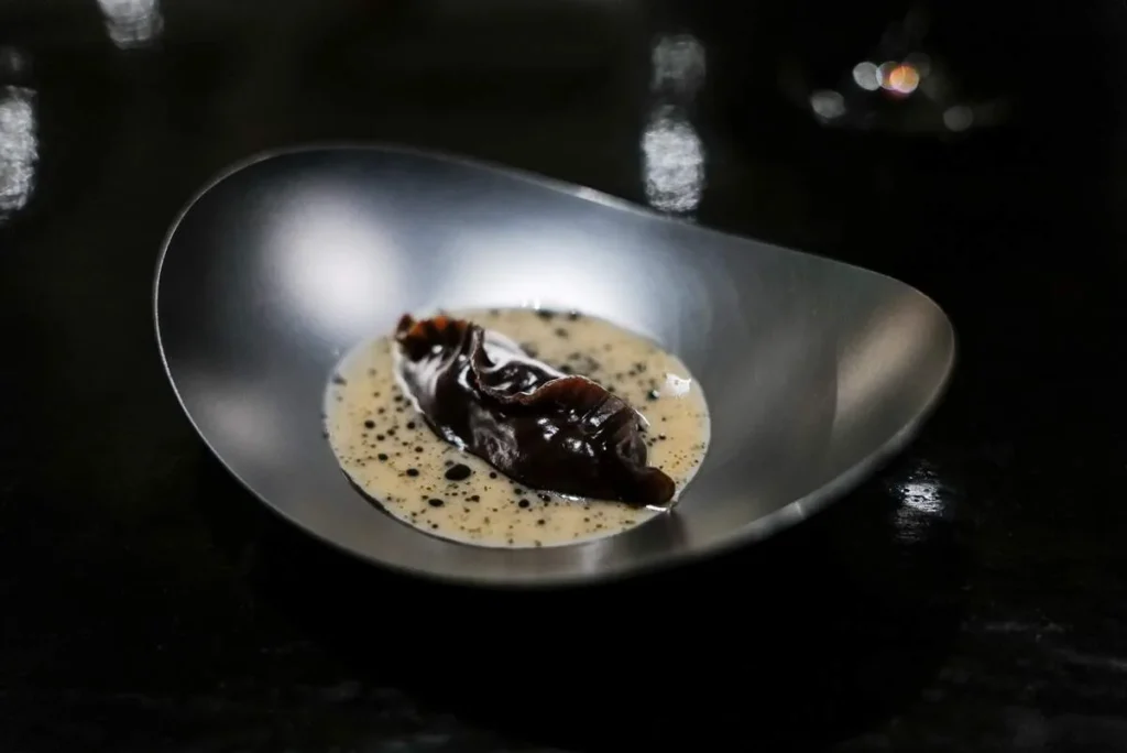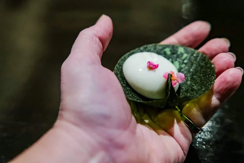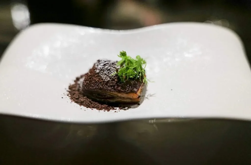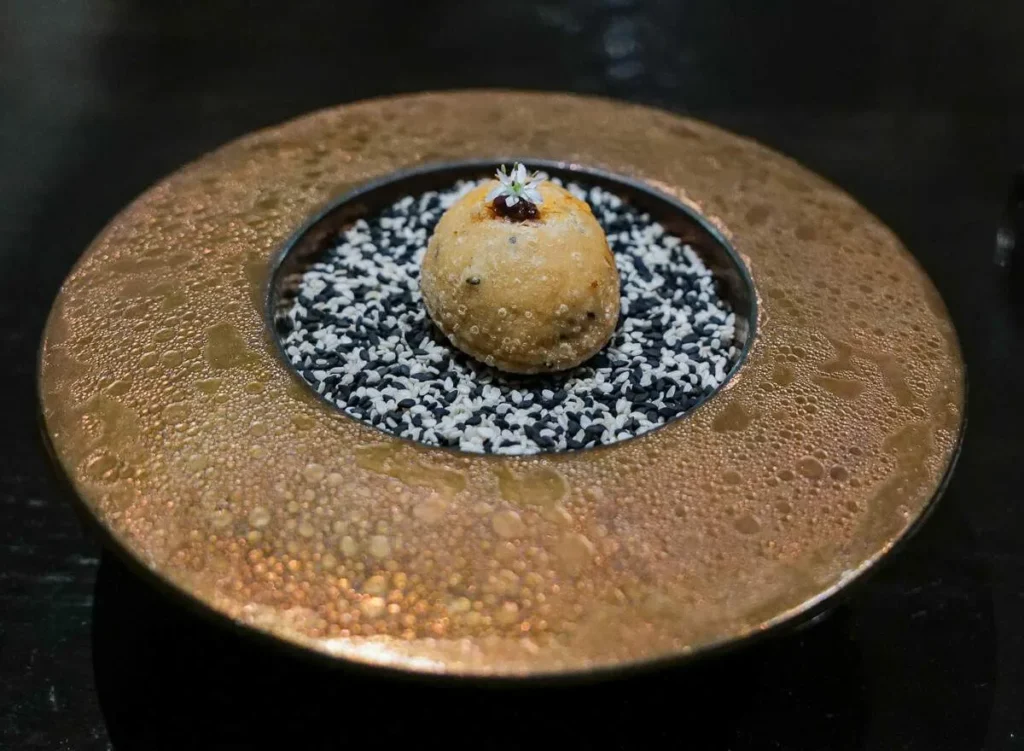 Momo, gyoza, empanada, dumpling… kjært barn har mange navn. Gaggan har laget en dumpling med et skinn av sort hvitløk fylt med vintersopp, rømme, olje av bukkhornkløver og vin som er igjen i glassene etter gjestene som ikke har drukket opp.