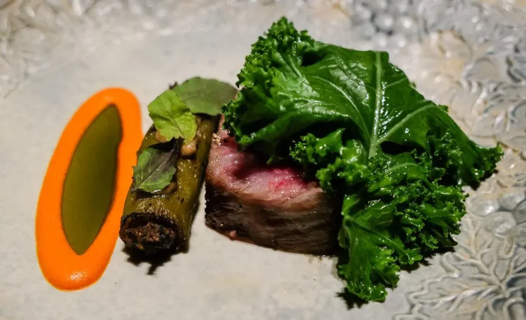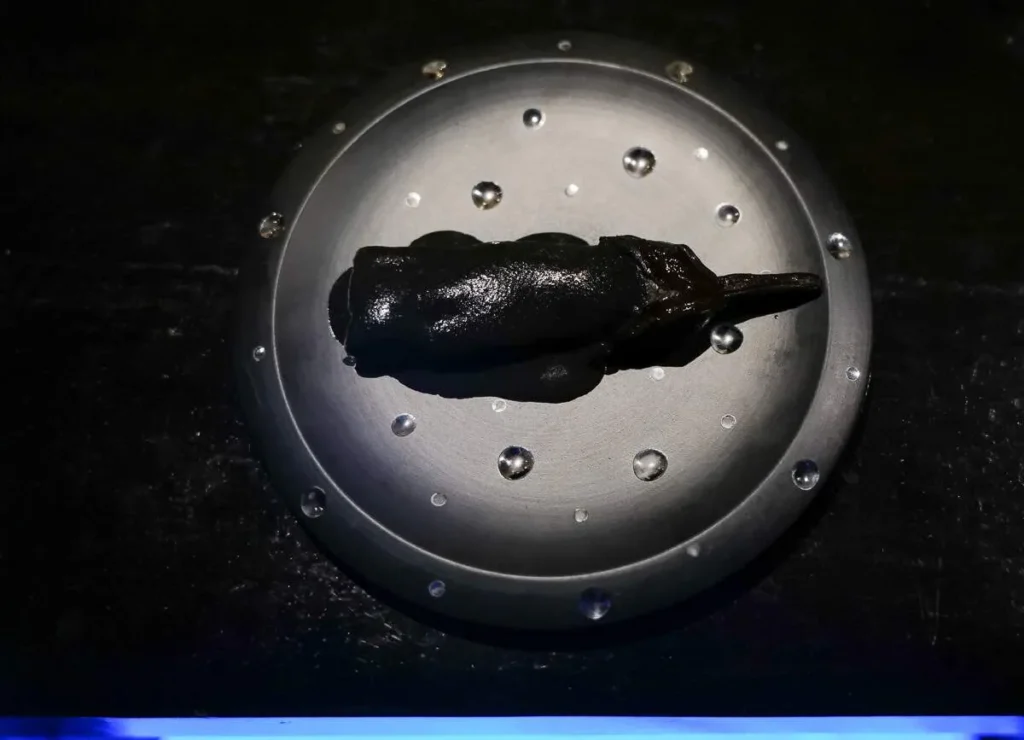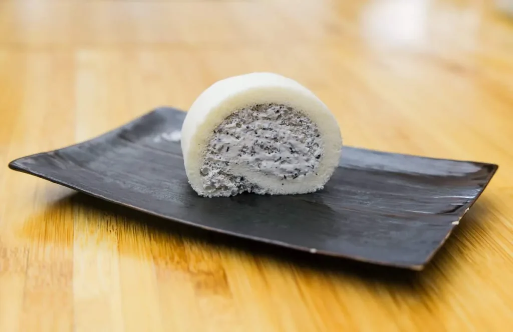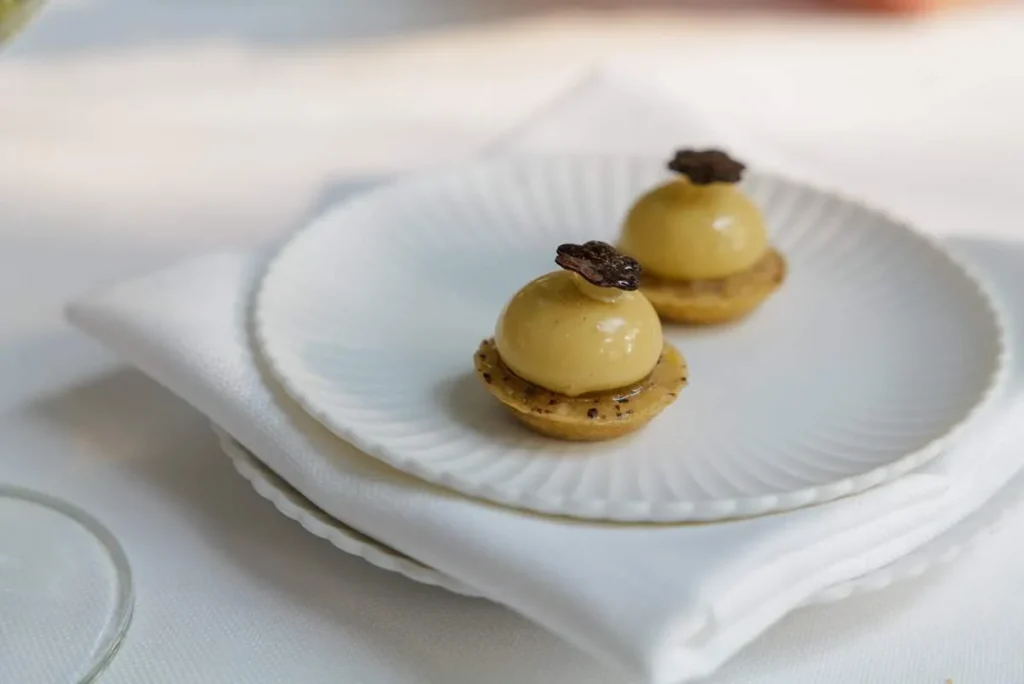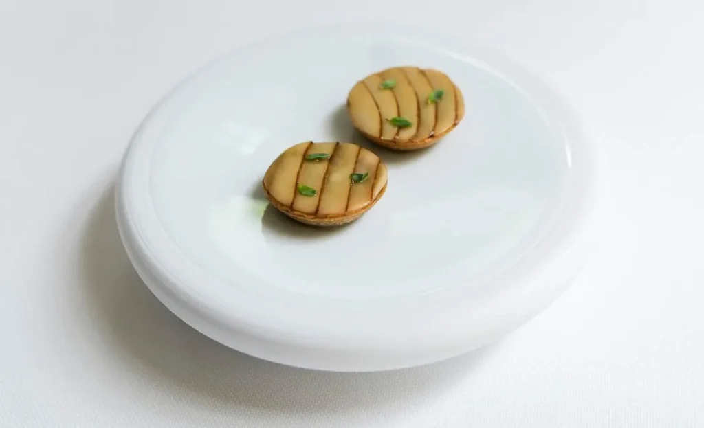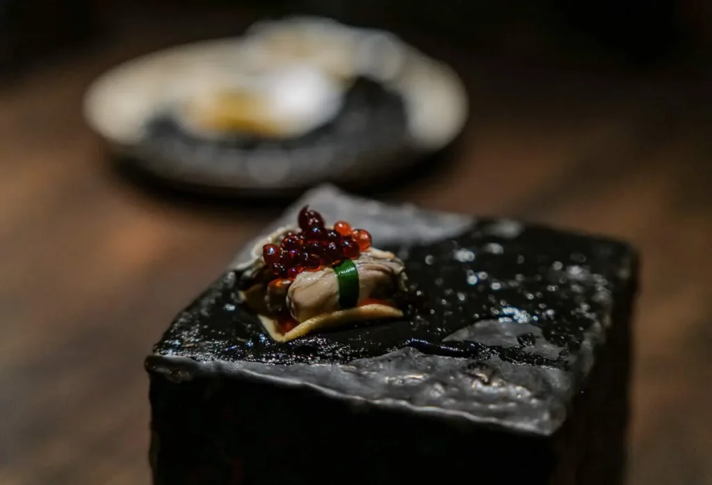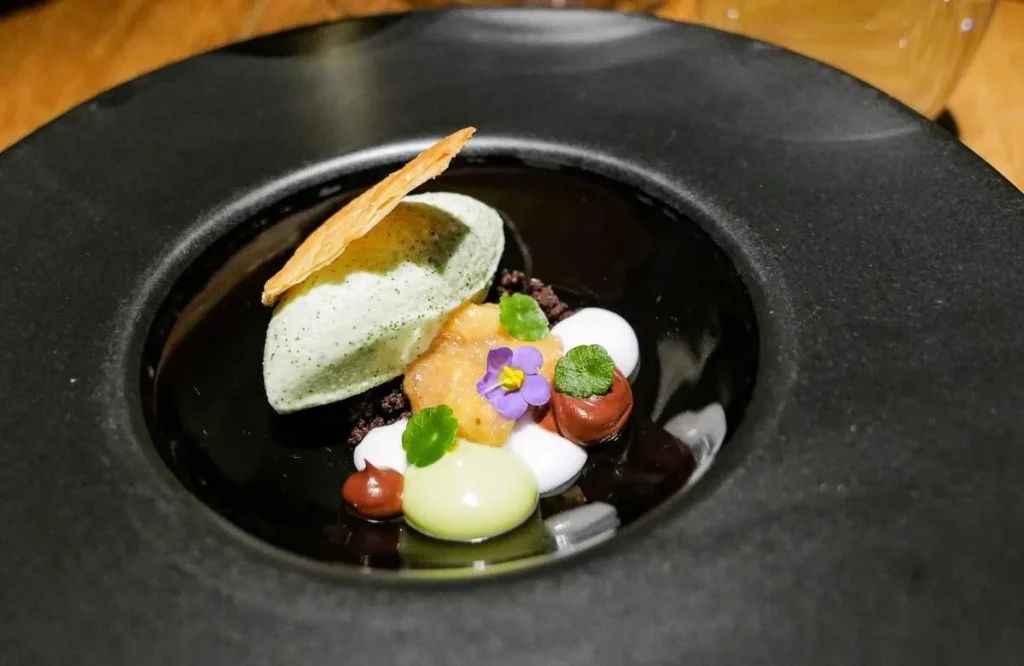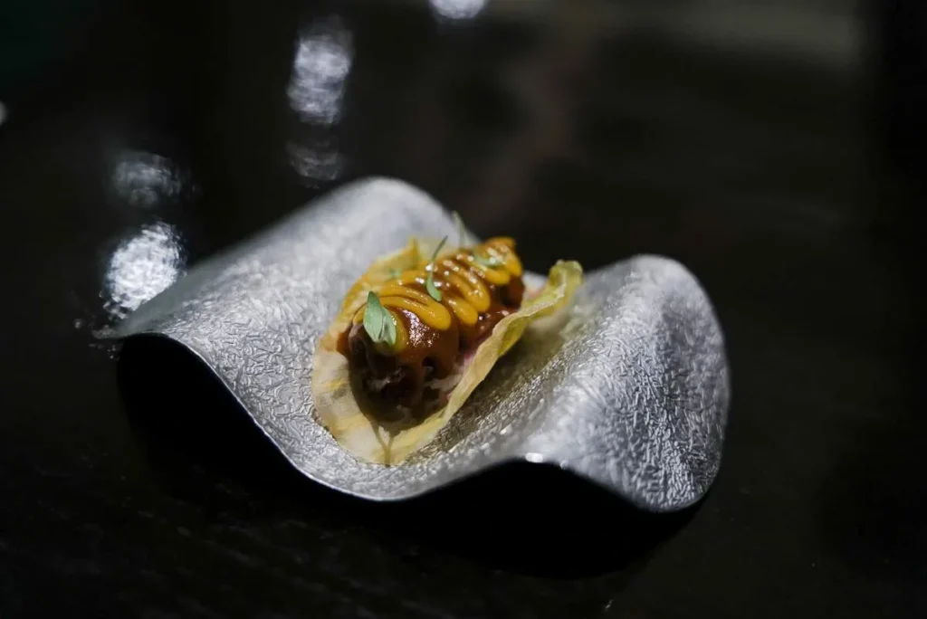 Momo, gyoza, empanada, dumpling… kjært barn har mange navn. Gaggan har laget en dumpling med et skinn av sort hvitløk fylt med vintersopp, rømme, olje av bukkhornkløver og vin som er igjen i glassene etter gjestene som ikke har drukket opp.