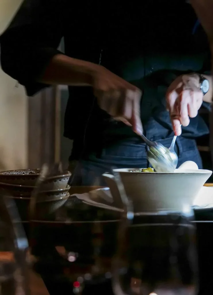 Sommelier Vladimir skjenker vin. Denne kvelden er den legendariske vinmakeren Christian Tschida tilstede i restauranten. Det er klart at en av hans viner kommer til å dukke opp i glasset.