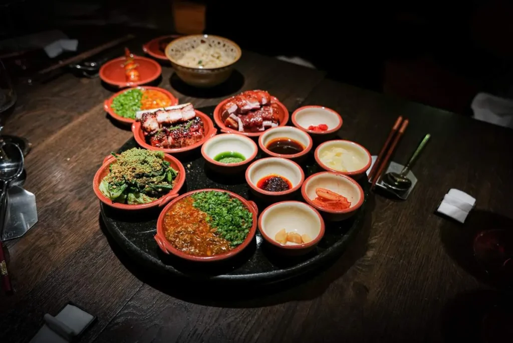 Stekt ris er neste rett. Men det er ikke så enkelt som det høres ut som. Et stort brett med alskens småretter kommer inn og vi forsyner oss av det fantastisk smakfulle utvalget. Kort presentert: