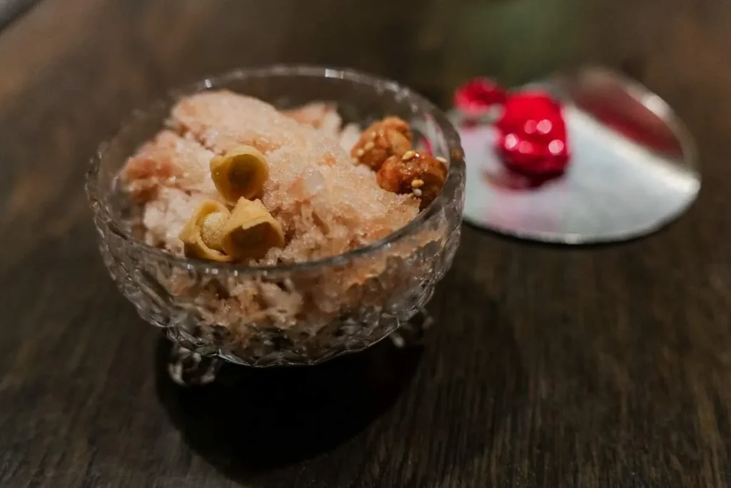 Denne desserten av en slags lapskaus av alt. Litt mye, for min smak, men deilig frisk med shaved is som japansk Kakigori toppet med masse ingredienser. Artig og spennende avslutning på et usedvanlig deilig måltid.