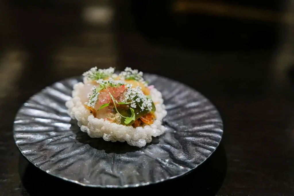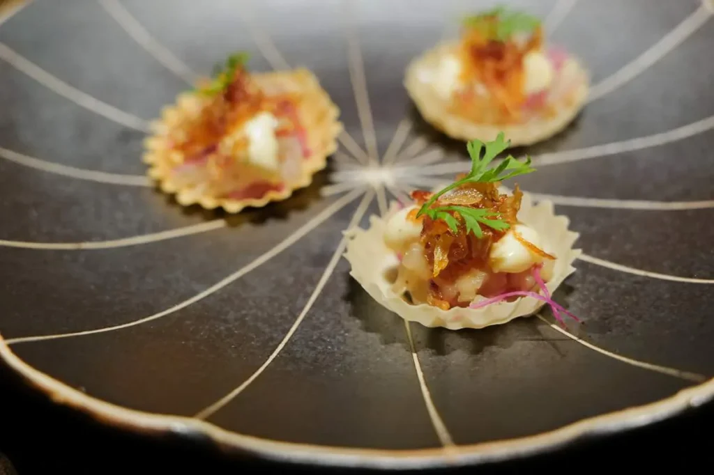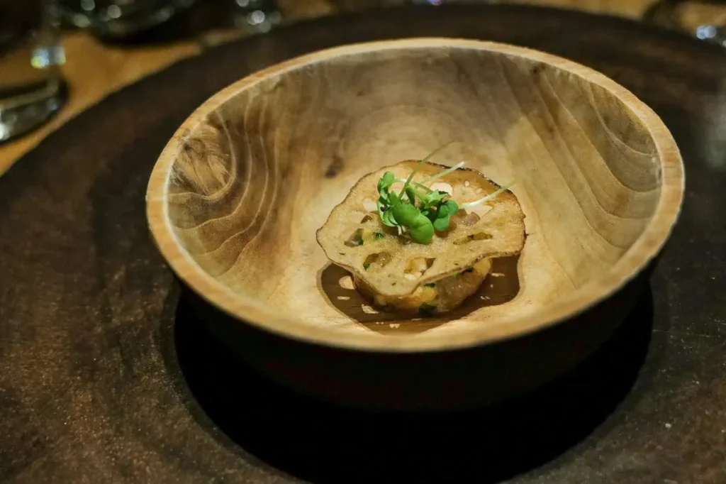 Vi får en rekke snacks til å begynne med: Krokett, østers, glassmanet og lotus med lokal fisk. Vakkert og velsmakende det hele.