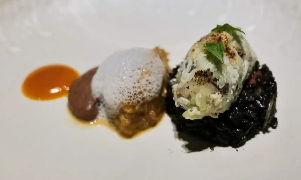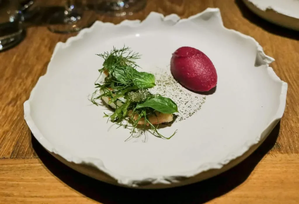 Første rett er banana prawn med seagrape (som jeg ikke aner hva heter på norsk), salt rødbeteis med chili. Ikke bare en vakker rett, men utrolig velbalansert i smak og tekstur.