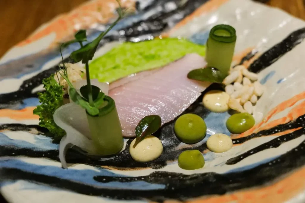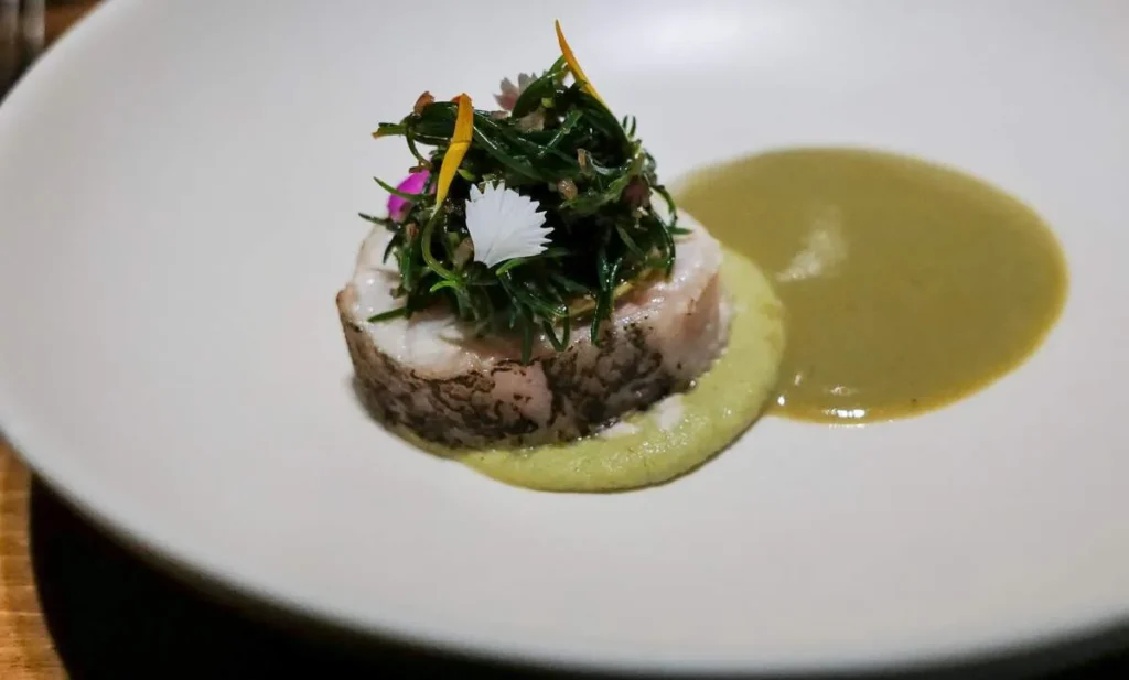 Kongemarellen vi får servert er tørrmodnet i to dager og serveres med mais, avokado og en grønn deilig saus. En nydelig rett.