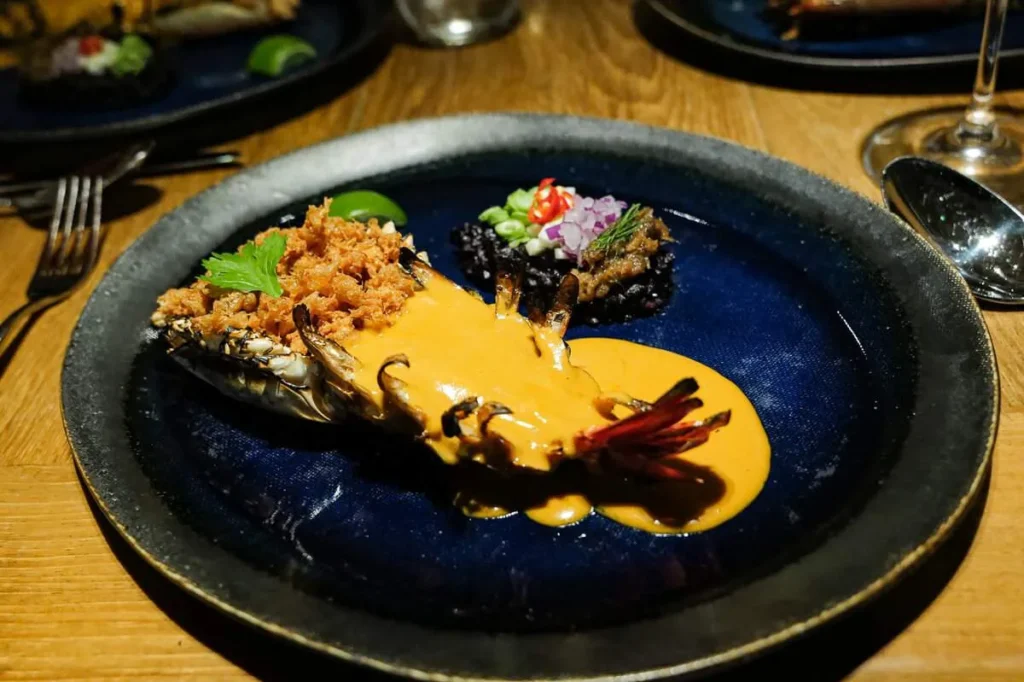 Vi får en bonusrett inn på bordet. River Prawns store som hummer servert med en deilig aromatisk saus som smaker som Thailand i mangel av nærmere beskrivelse. Friterte smuler av reker servert i hodet. Deilig og mektig.