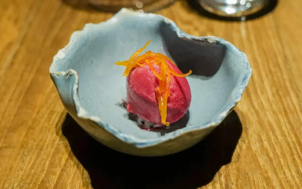 Vi får to desserter. En deilig iskald sorbet av dragefrukt og roselle (en slags hibiskus) og kandisert skall av appelsin. Så smakfull og deilig oppfriskende. Og de fargene!