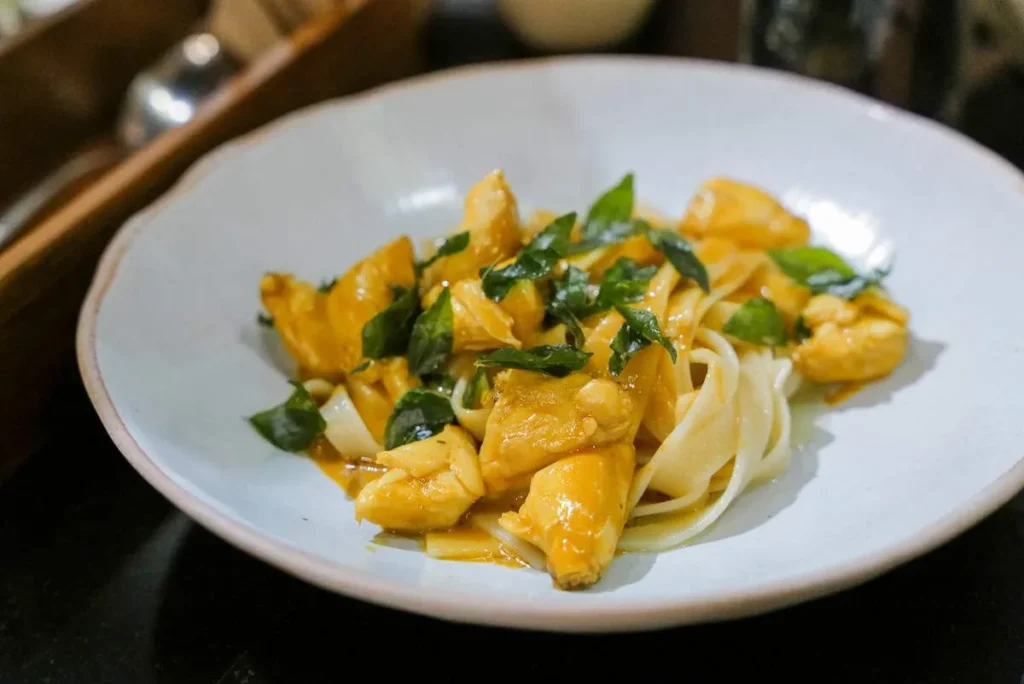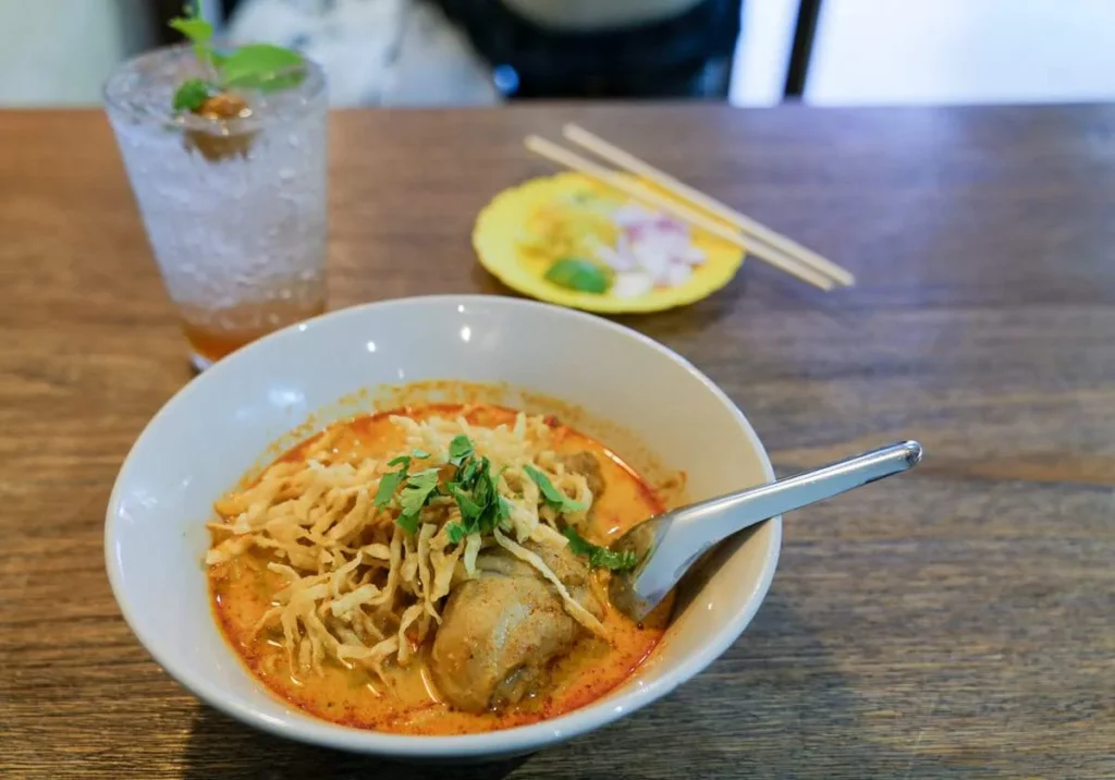 Ongtong Khaosoi (adresse: 31 Phahonyothin Soi 7, Samsen Nai, Phaya Thai, Bangkok 10400) serverer nordthailandsk mat som fløtter på seg. Det er hot. Det kan jeg love deg. Men ufattelig godt. Stedet har Bib Gourmand i Michelinguiden, men det har ikke gjort noe med prisene. Jeg tror jeg betalte ca 40 kr for en rett og en plommesoda. Retten jeg bestilte var Chicken Khasoi med friterte nudler, kyllingklubbe og en fantastisk currykokossaus som smalt i pappen. Soda med salt plomme roer ned det hete, men det er en hete du bare vil ha mer av. Jeg spiste dette til frokost og det kan man kalle en ekte kickstart på dagen.