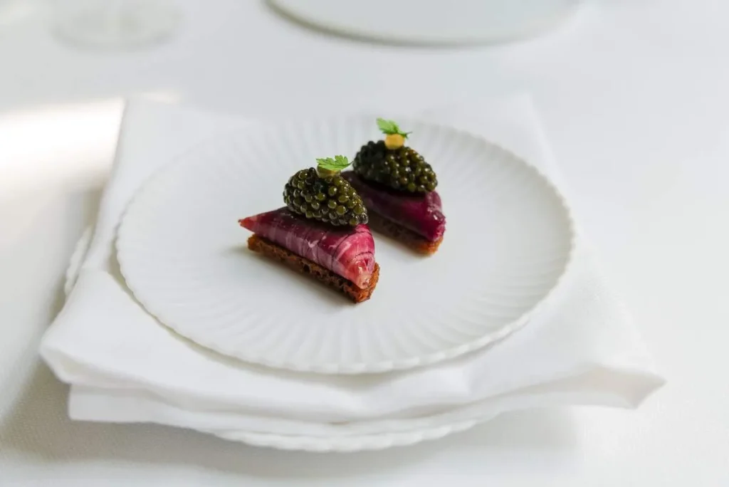 Labskaus & Aki Imperial Ossetra Caviar med corned beef og rødbete er den vakreste lapskausen jeg har sett i alle fall. En perfekt munnfull som nesten er for vakker til å spise.