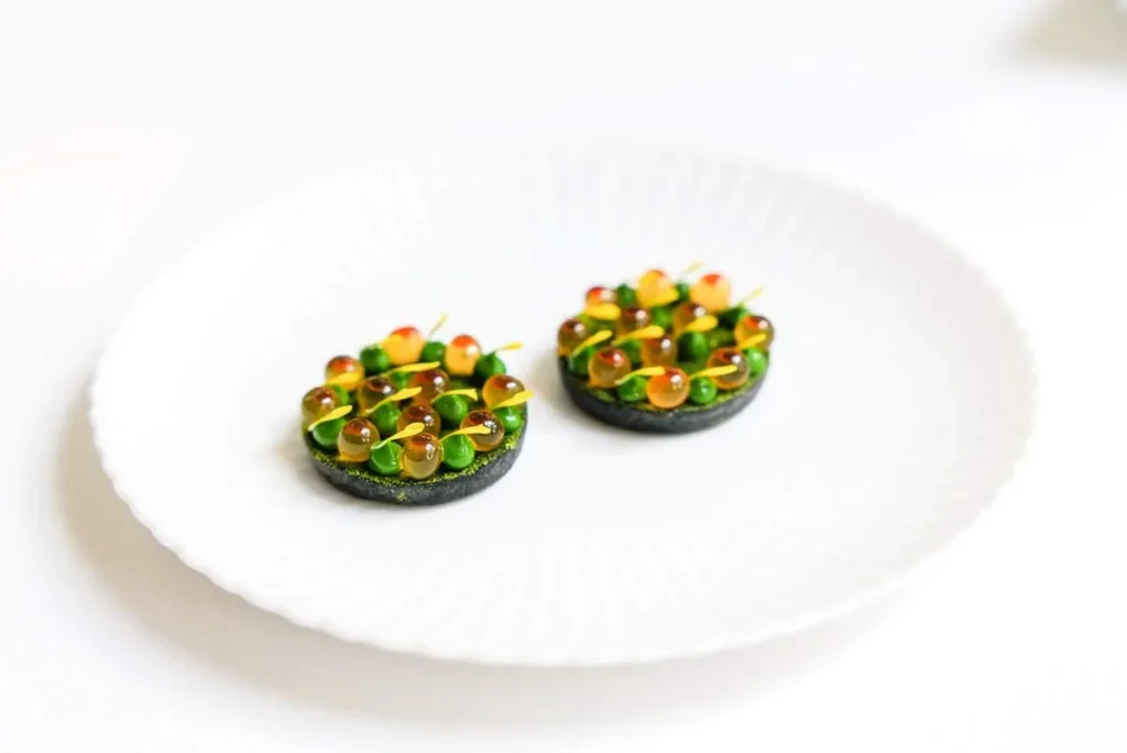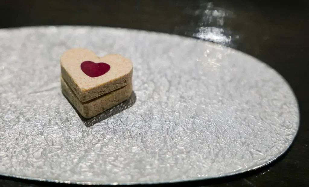 Gaggan beskriver «Dusty roads of India» med en hjerteformet uncooked cookie med bengalsk sennepsfrø som smuldrer i munnen.