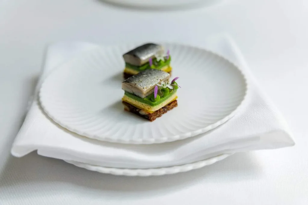 Bismarckherring: syltet sild med egg og gulbete. Igjen en ingrediens du ikke venter å få på en tostjerners restaurant. Skal si brødrene er flinke til å gjøre gull ut av tradisjonsmat. Det burde noen gjøre her hjemme i Norge også.