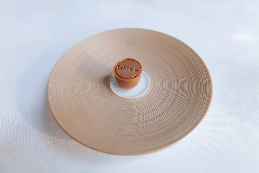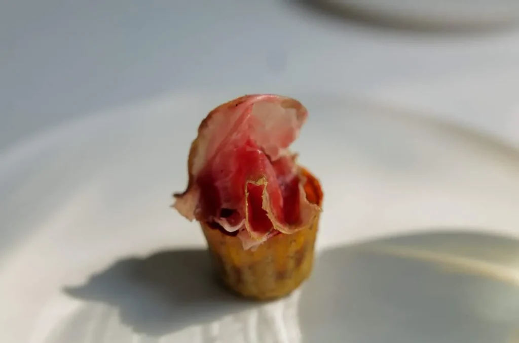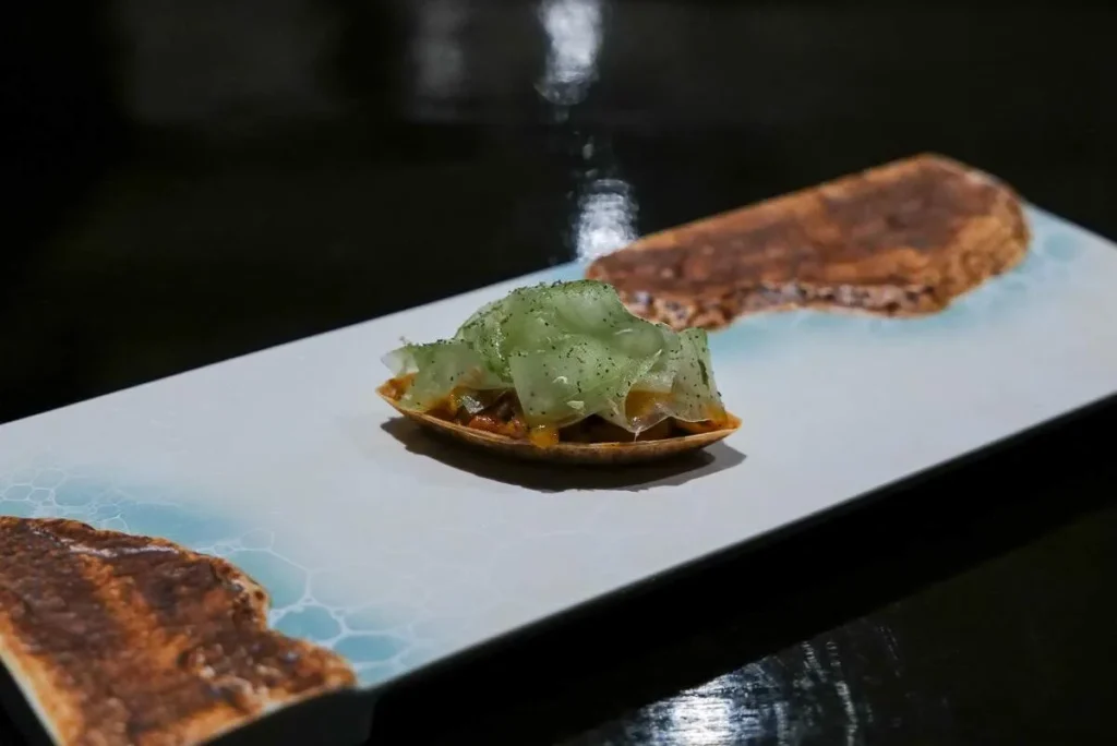 Neste snack er kanskje en av mine favoritter denne dagen. Et slags kikertpapir med spisskummenolje og små dråper granateplemelasse. I munnen smaker det som det perfekte sprøstekte kyllingskinn. Kikerter er en viktig råvare i India og Gaggan klarer å presentere den på den mest delikate måten. En enkel og billig ingrediens smaker som en million.