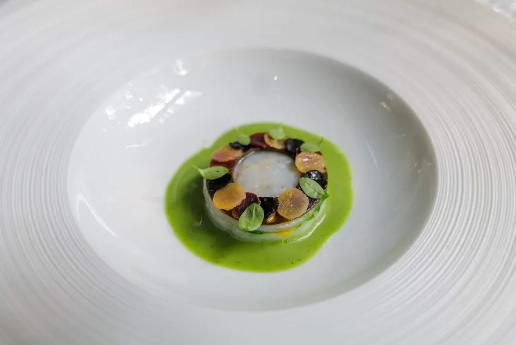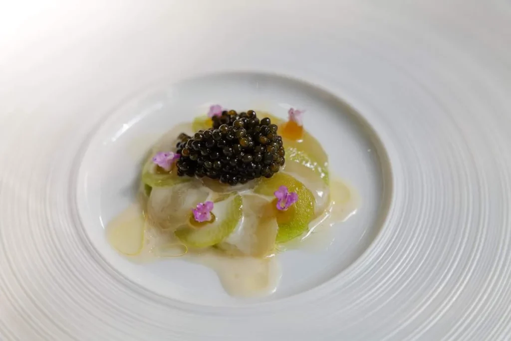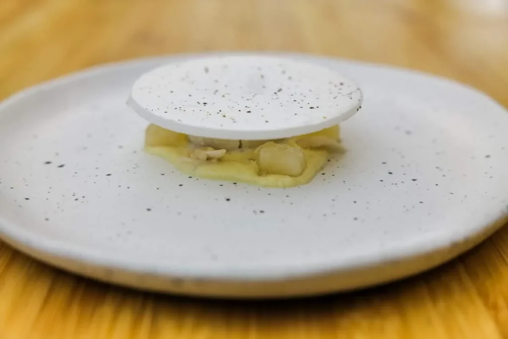 Scallop & Kristal Caviar med hasselnøtt og tang. Råmarinert kamskjell med eple og selleri. Nå er vi over på de større rettene og dette er en trygg og velkjent kombinasjon. Deilig, rett og slett.