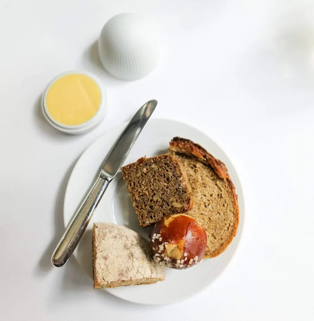 Vi får brødservering og et utvalg tyske brød og salt smør. Jeg prøver så godt jeg kan å holde lanken unna, men det er faktisk ikke så lett. Surdeigsstarteren deres har vært med dem i alle de 8 årene restauranten har eksistert.