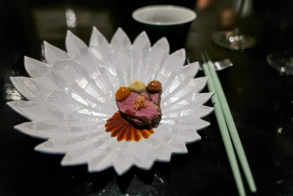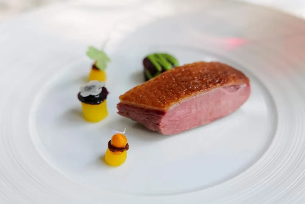 Duck – aged for 10 days med beter, kirsebær og kaffe. Dt er interessant det der med å bruke kaffe som krydder. Jeg har selv med stort hell laget en café au lait-saus til and (og oksekjøtt, samt viltkjøtt) og den lille bitterheten er perfekt til det mørke kjøttet. Dette er nok retten jeg vil huske aller lengst fra mitt besøk på denne staslige restauranten. Det er en kunst å få til skinn på denne måten. Det er like perfekt som på en vellaget pekingand. En fryd å spise.