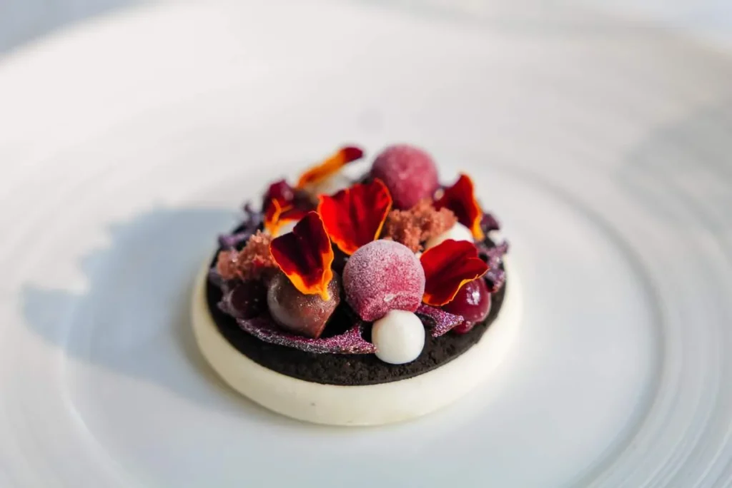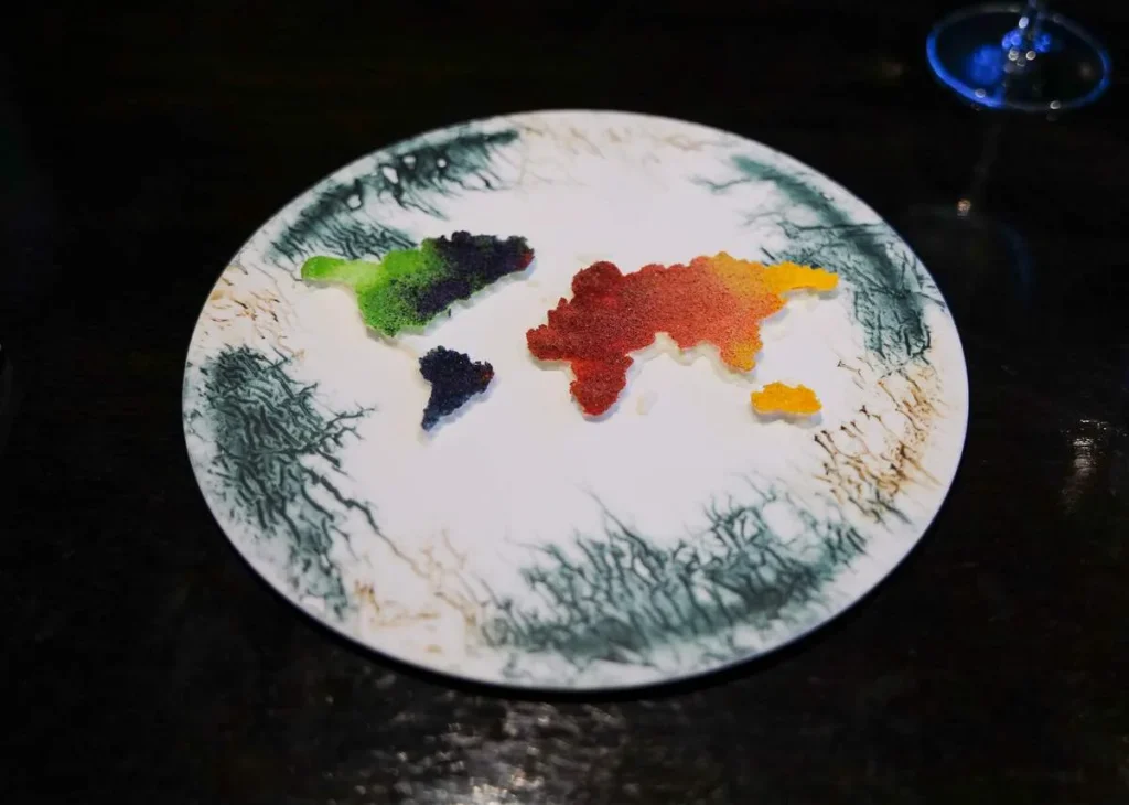 Vi nærmer oss slutten av måltidet og showet. En av Gaggans signaturer er desserter som kan slikkes og denne er en ny variant som han har beskrevet som «Flower Power». Jasmin fra hagen dominerer smaken på den tykke kremen som er dekket av en verden i regnbuefarger. – Hver dag når man ser på nyhetene er det negative nyheter som dominerer. Frykt, skremsel og negativitet. Jeg vil at siste rett skal være et vakkert minne. The world is on your plate. Lick it.