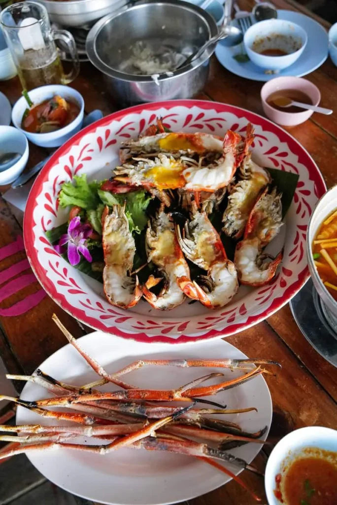 Du kommer hit med taxi eller buss 33 fra Sanam Luang eller buss 166 fra the Victory Monument. Du kan også ta Chao Phraya Express Boat fra Saphan Taksin. Fergen fra fastlandet vis-a-vis Ko Kret går fra Wat Klang Kret. Ikke langt unna ligger en perle av en restaurant. I helgene reiser folk fra Bangkok ut hit for å spise godt og det var for meg en av den fineste matopplevelsene på turen min til Thailand. Krua Ja Yan 2 (adresse: 84/14 หมู่3 ถนน Sukhaprachasan 1, Pak Kret District, Nonthaburi 11120) er virkelig en opplevelse. Du sitter ved elven og spiser den ferskeste sjømaten mens mallene hopper i vannkanten. Og selvsagt har de malle på menyen. Og de store elverekene som vi fikk på Le Du. Perfekt tilberedt med typiske thaisauser som tilbehør. Vi får hotpot med malleegg, blekksprutegg, thaifiskeker, fritert hel fisk, sprøstekt minifisk… Det bugner og vi elsker alt! Ta turen hit og spis lunsj før du drar over til Ko Kret. Er ikke det en glimrende plan, da?