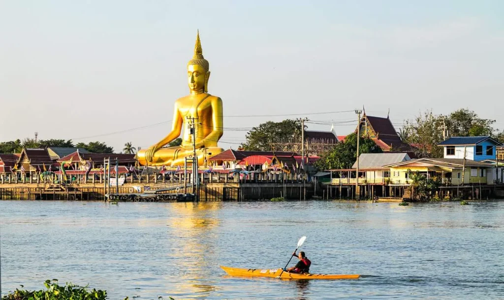 Fra Ko Kret har man god utsikt til Wat Poramai Yikawat og den store gullfargede buddhaen på fastlandet.