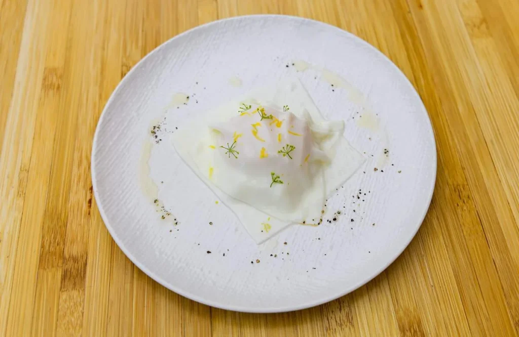 Dahi Bhalla «Exploding yoghurt». Vi får et blad i håndflaten. På dette bladet legges det en hvit glinsende kule. Den skal spises i en bit. I munnen eksploderer den og det er klart en liten dose popping candy i yoghurtkulen. En deilig start.