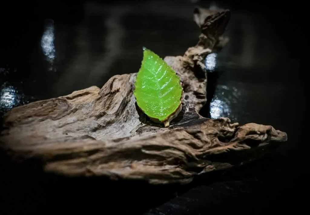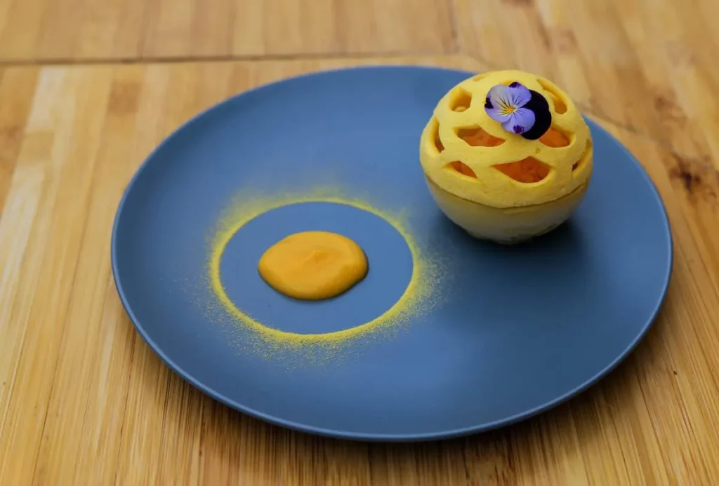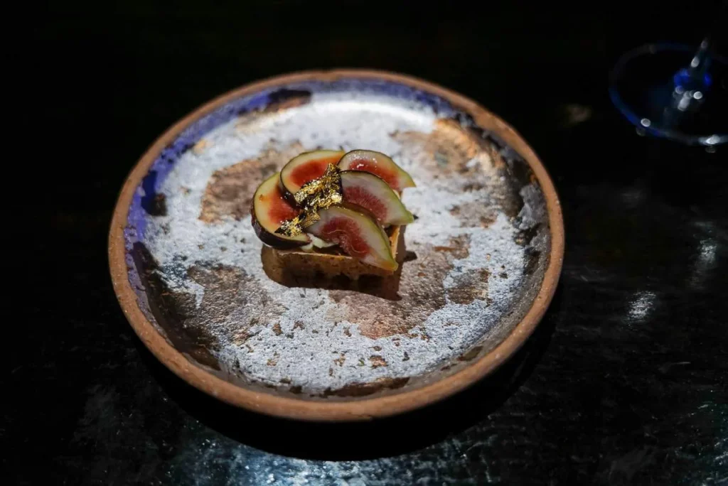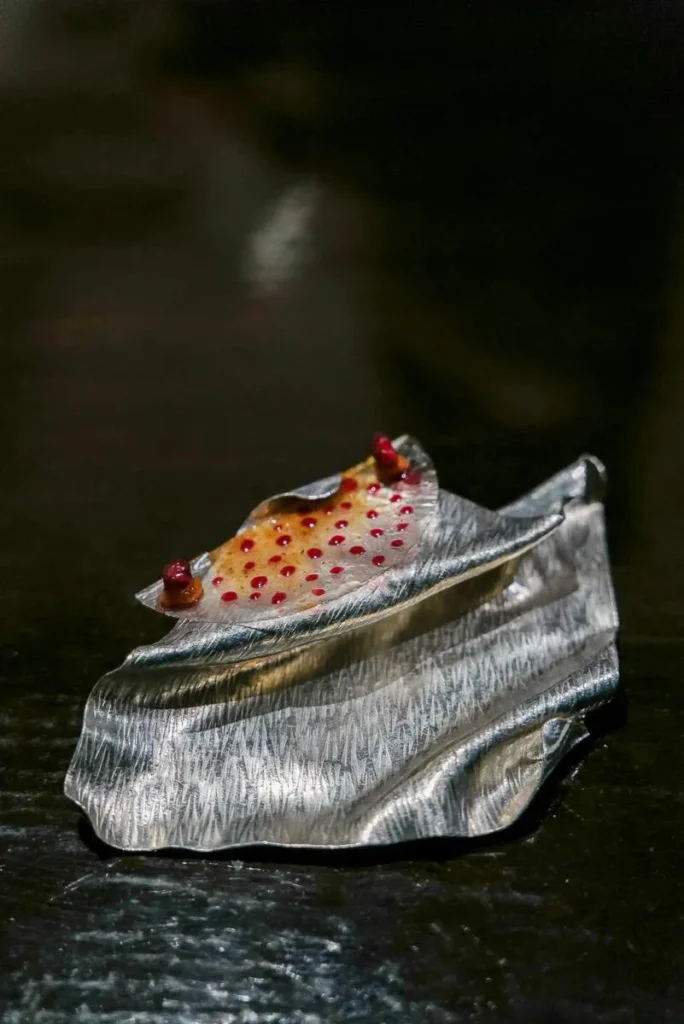 Jeg velger bort foie gras i 99 % av tilfellene, men Gaggan bruker etisk foie gras fra spanske Sousa and Labourdette og da er det greit. Det presenteres som et iskaldt mangoblad.