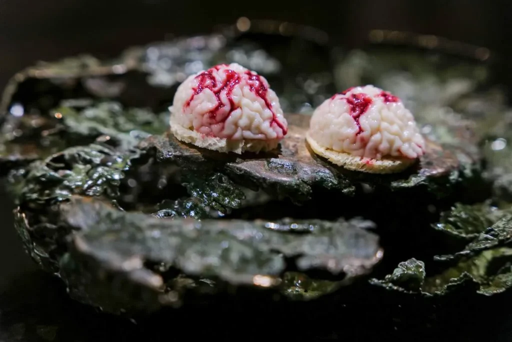 Det er derfor han i neste rett ber om tillit. Foran oss er en liten hjerne med «blod» på toppen. Han ber oss putte den i munnen før vi får vite hva det er. Forklaringen kommer etterpå. Han spøker med at hva er vel mer lokalt og kortreist enn de mange rottene som vandrer Bangkoks gater? Han forteller at de fôres med hvite asparges. Sannheten er det er en slags hjerneformet blancmange laget med sorte trøfler, hvite asparges og rødbete-blod.