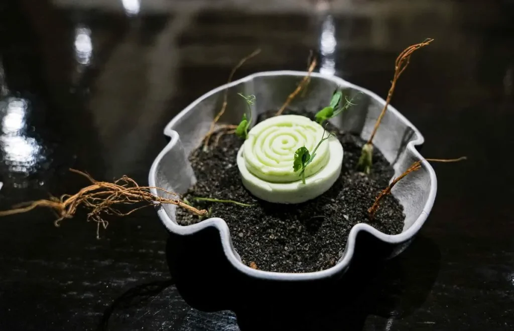 «Grav etter poteten» Neste rett er en hyllest til Nightshade-grønnsaker (Søtvierfamilien). Altså de som vokser i mørket om natten, gjerne under jorden som poteten. Vi får en iskrem og marengs med indiske smaker og grønne erter. Vi spiser røtter og graver med fingrene i «jorden» til vi finner en uthult potet med ingefær.