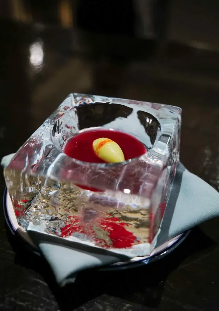 Første akt avsluttes med en skål laget av is. Den fylles med ingredienser som til sammen smaker som en deilig Bloody Mary med en shot vodka. Gaggen ber oss slikke isen, men som nordboer vet man hva som skjer hvis man setter tungen i direkte kontakt med en isklump, så den går jeg ikke på.