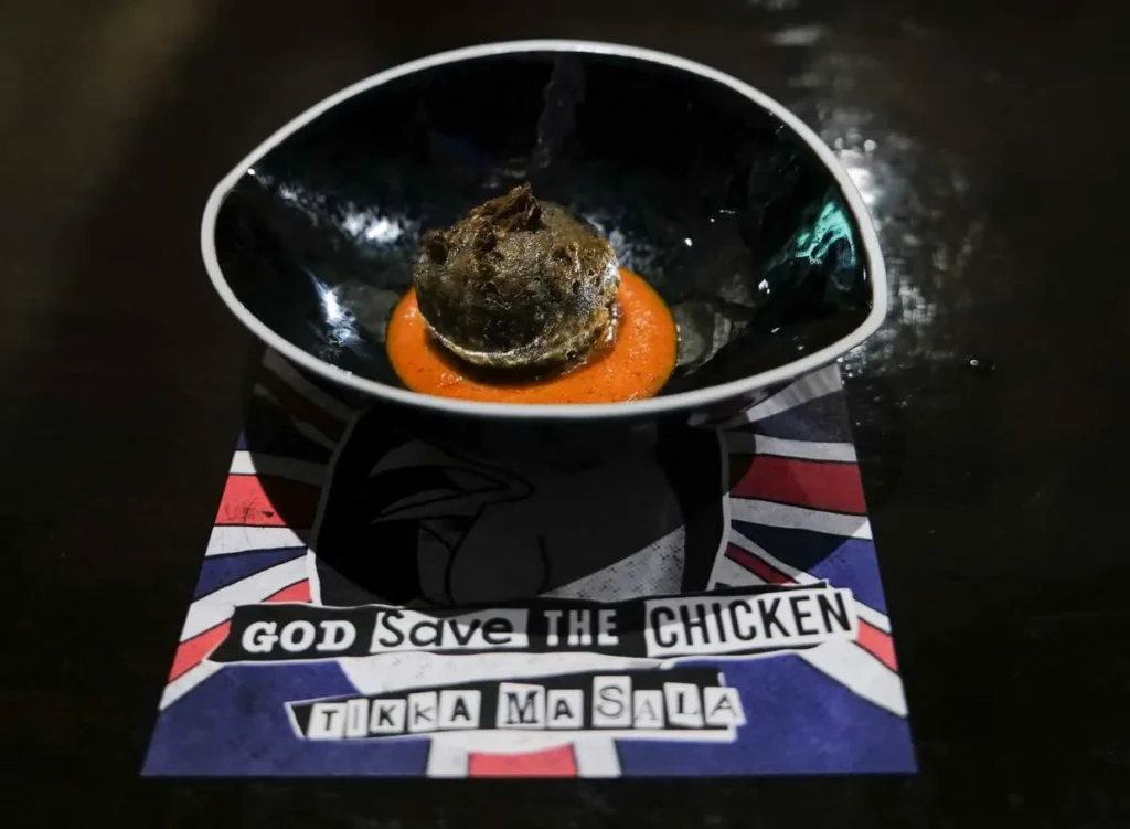 Gaggan forklarer neste rett – en krokett med chicken tikka masala – retten som ble utviklet i Glasgow. Den indiske kokken er ikke spesielt nådeløs når han beskriver hvordan den på det aller verste kan serveres. – Mild dritt som smaker av tomat. Gaggans versjon i en krokett smaker fortreffelig.