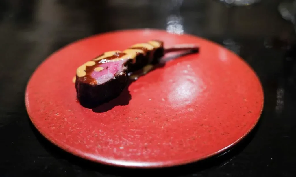 Laal maans fra Rajasthan med thailandsk lam servert i en særdeles spicy rød chilisaus og yoghurt. Spises som en lollipop. Fantastisk konsistens og hete. Ekte «fingermat»