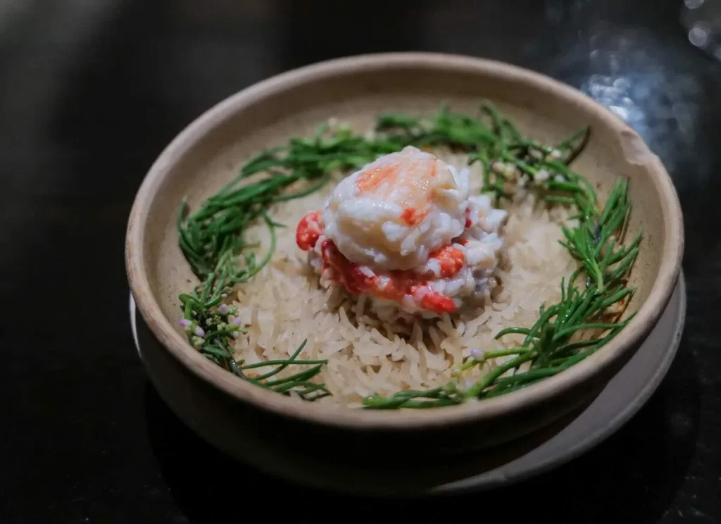 Kongekrabbe fra Japan (Gaggan bruker ikke hummer) med ris og løkkompott. Retten forsegles i leirkrukke og bakes i ovnen. En mektig rett, men det er også den siste saltretten denne kvelden. Mektig vakker og deilig.